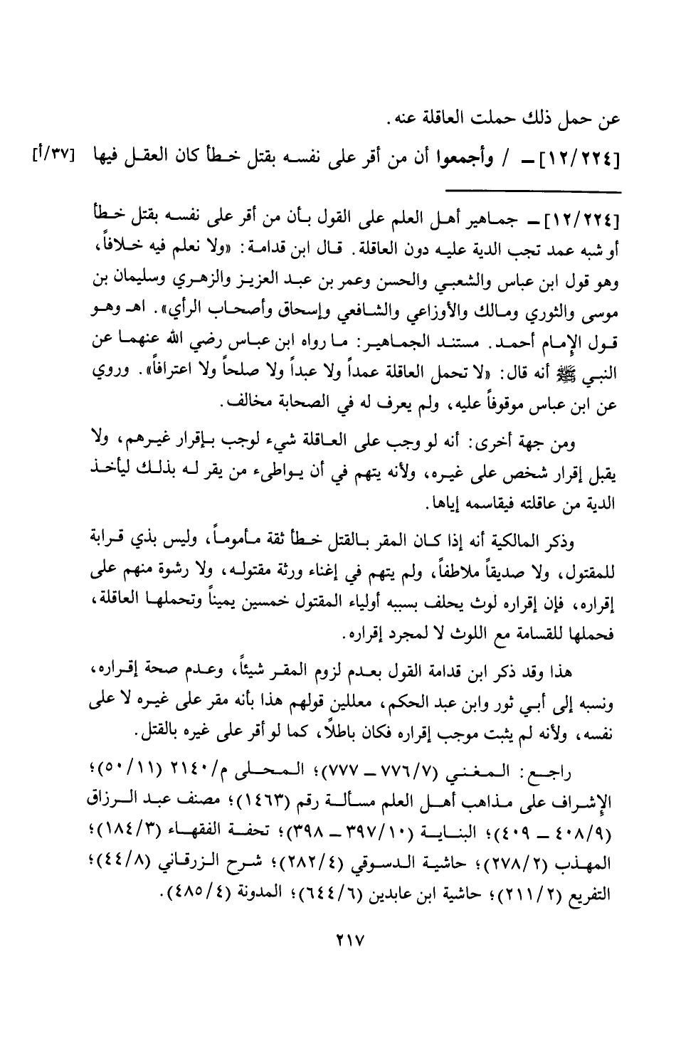 [224/ 12]- / وأجمعوا أن من أقر على نفسه بقتل خطأ كان العقل فيها
