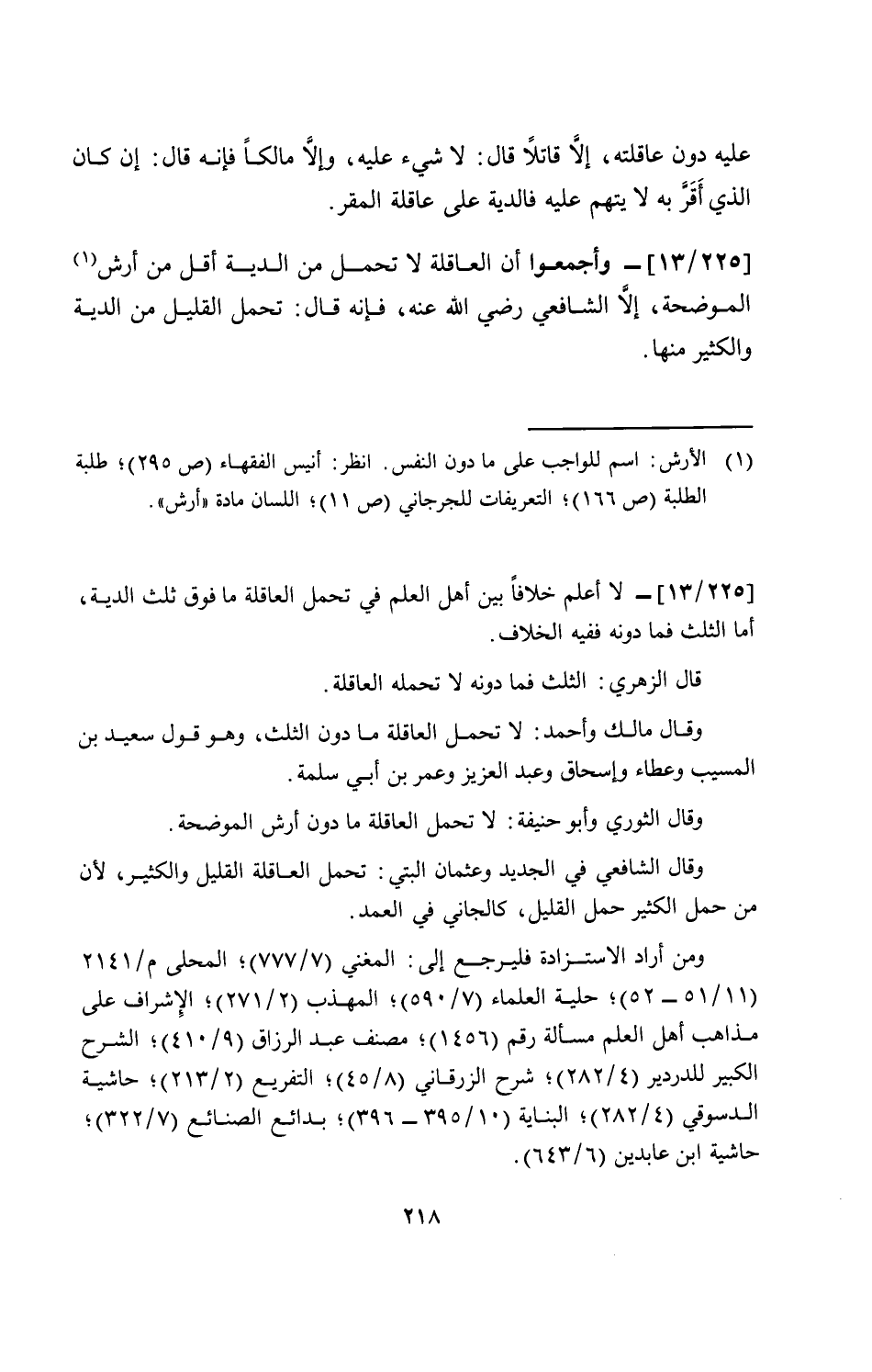 [225/ 13]- وأجمعوا أن العاقلة لا تحمل من الدية أقل من أرش الموضحة، إلا الشافعي رضي الله عنه، فإنه قال: تحمل القليل من الدية والكثير منها.
