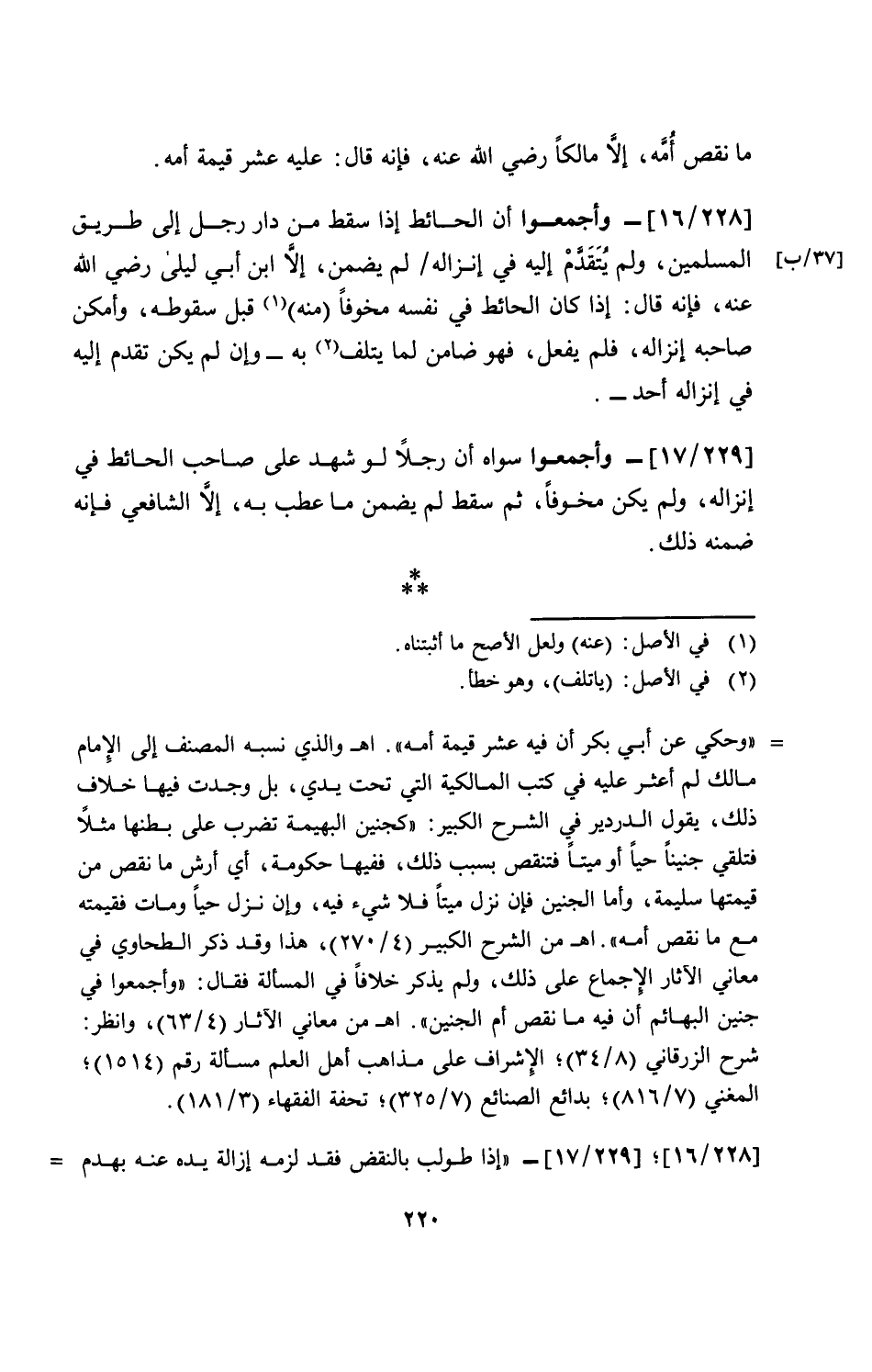 [229/ 17]- وأجمعوا سواه أن رجلًا لو شهد على صاحب الحائط في إنزاله، ولم يكن ذلك مخوفًا، ثم سقط لم يضمن ما عطب به، إلا الشافعي فإنه ضمنه ذلك.