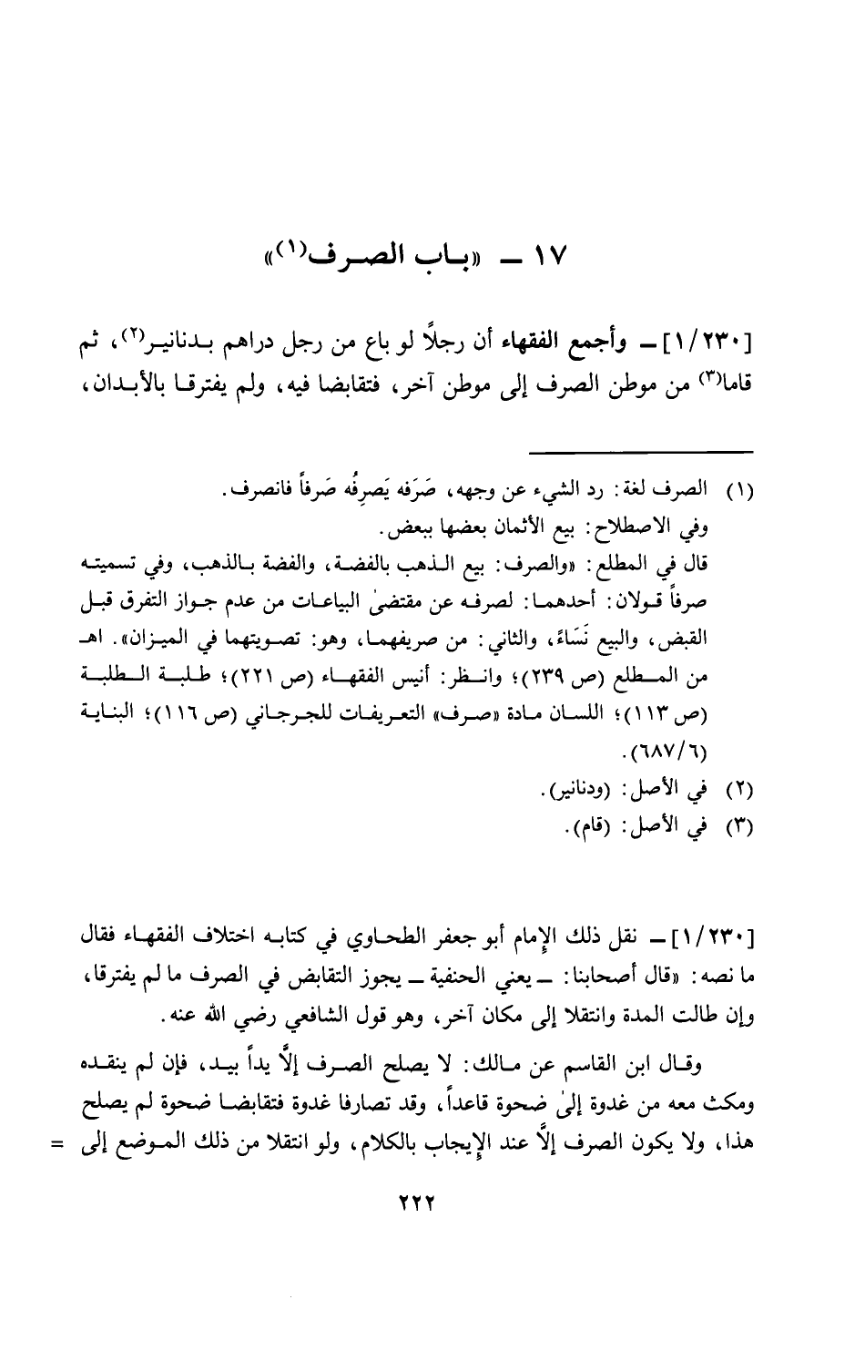 [230/ 1]- وأجمع الفقهاء أن رجلًا لو باع من رجل دراهم بدنانير، ثم قاما من موطن الصرف إلى موطن آخر، فتقابضا فيه، ولم يفترقا بالأبدان،