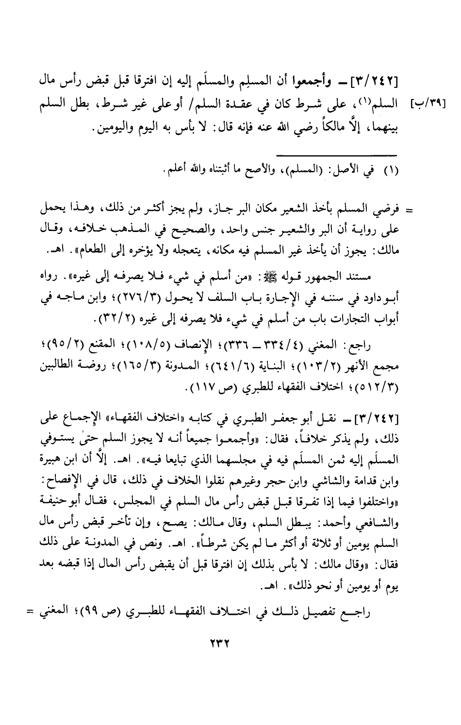 [242\ 3]- وأجمعوا أن المسلِم والمسلَم إليه إن افترقا قبل قبض رأس مال السلم، على شرط كان في عقدة السلم\ أو على غير شرط، بطل السلم بينهما، إلا مالكاً رضي الله عنه فإنه قال: لا بأس به اليوم واليومين.