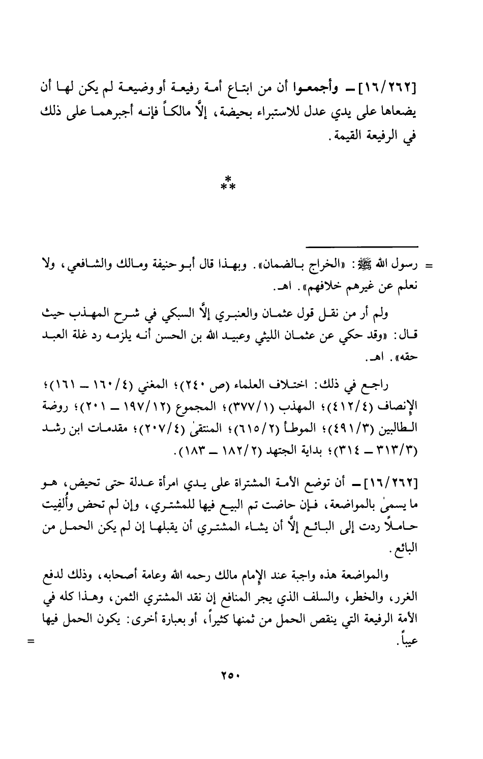 [262\ 16]- وأجمعوا أن من ابتاع أمة رفيعة أو وضيعة لم يكن لها أن يضعاها على يدي عدل للاستبراء بحيضة، إلا مالكاً فإنه أجبرهما على ذلك في الرفيعة القيمة.