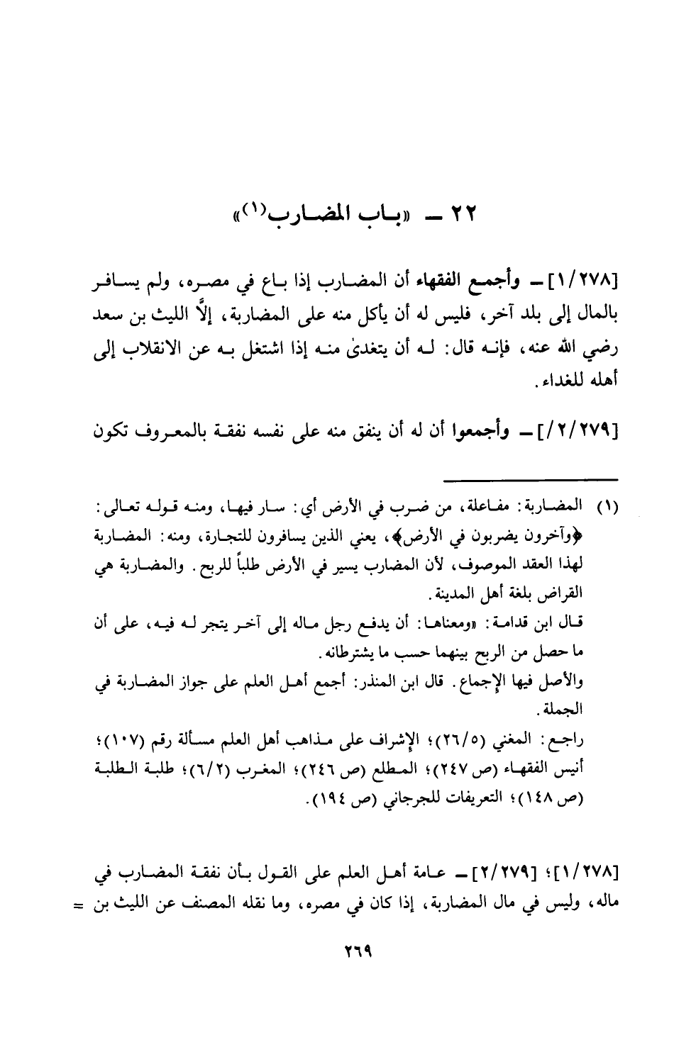 [278\ 1]-وأجمع الفقهاء أن المضارب إذا باع في مصره، ولم يسافر بالمال إلى بلد آخر، فليس له أن يأكل منه على المضاربة، إلا الليث بن سعد رضي الله عنه، فإنه قال: له أن يتغدى منه إذا اشتغل به عن الانقلاب إلى أهله للغداء.