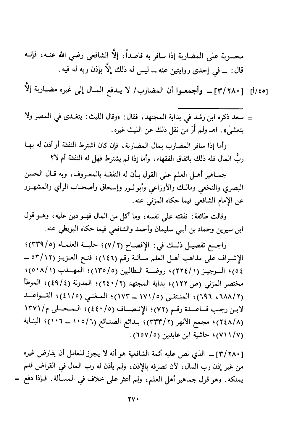 [280/ 3]- وأجمعوا أن المضارب/ لا يدفع المال إلى غيره مضاربة إلاَّ