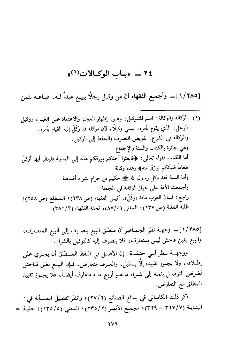 [285/ 1]- وأجمع الفقهاء أن من وكل رجلاً يبيع عبداً له، فباعه بثمن