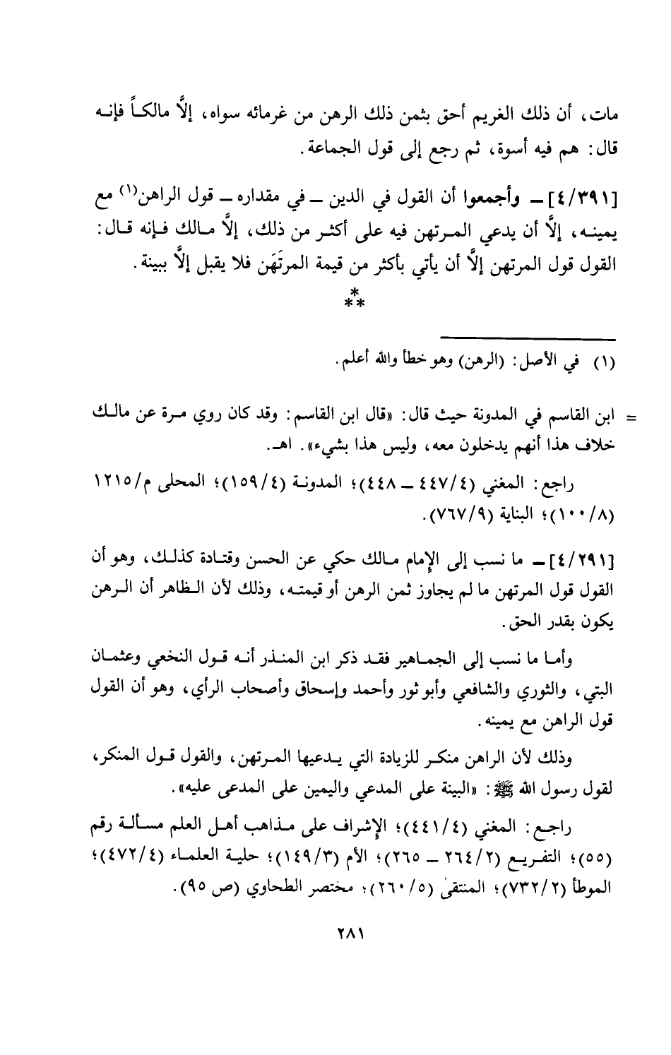 [391/ 4]- وأجمعوا أن القول في الدين-في مقداره- قول الراهن مع يمينه، إلاَّ أن يدعي المرتهن فيه على أكثر من ذلك، إلاَّ مالك فإنه قال: القول قول المرتهن إلاَّ أن يأتي بأكثر من قيمة المرتَهَن فلا يقبل إلاَّ ببينة.
