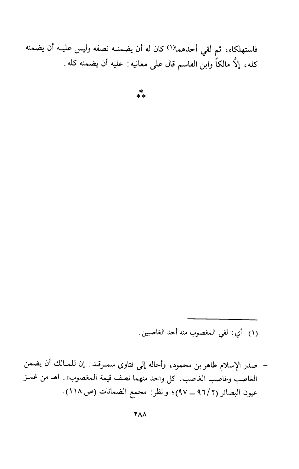 فاستهلكاه، ثم لقي أحدهما كان له أن يضمنه نصفه وليس عليه أن يضمنه كله، إلاَّ مالكاً وابن القاسم قال على معانيه: عليه أن يضمنه كله.