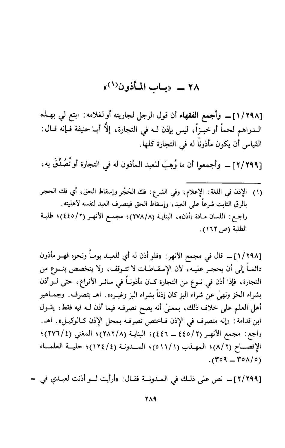[299/ 2]- وأجمعوا أن ما وُهِبَ للعبد المأذون له في التجارة أو تُصُدِّقَ به،