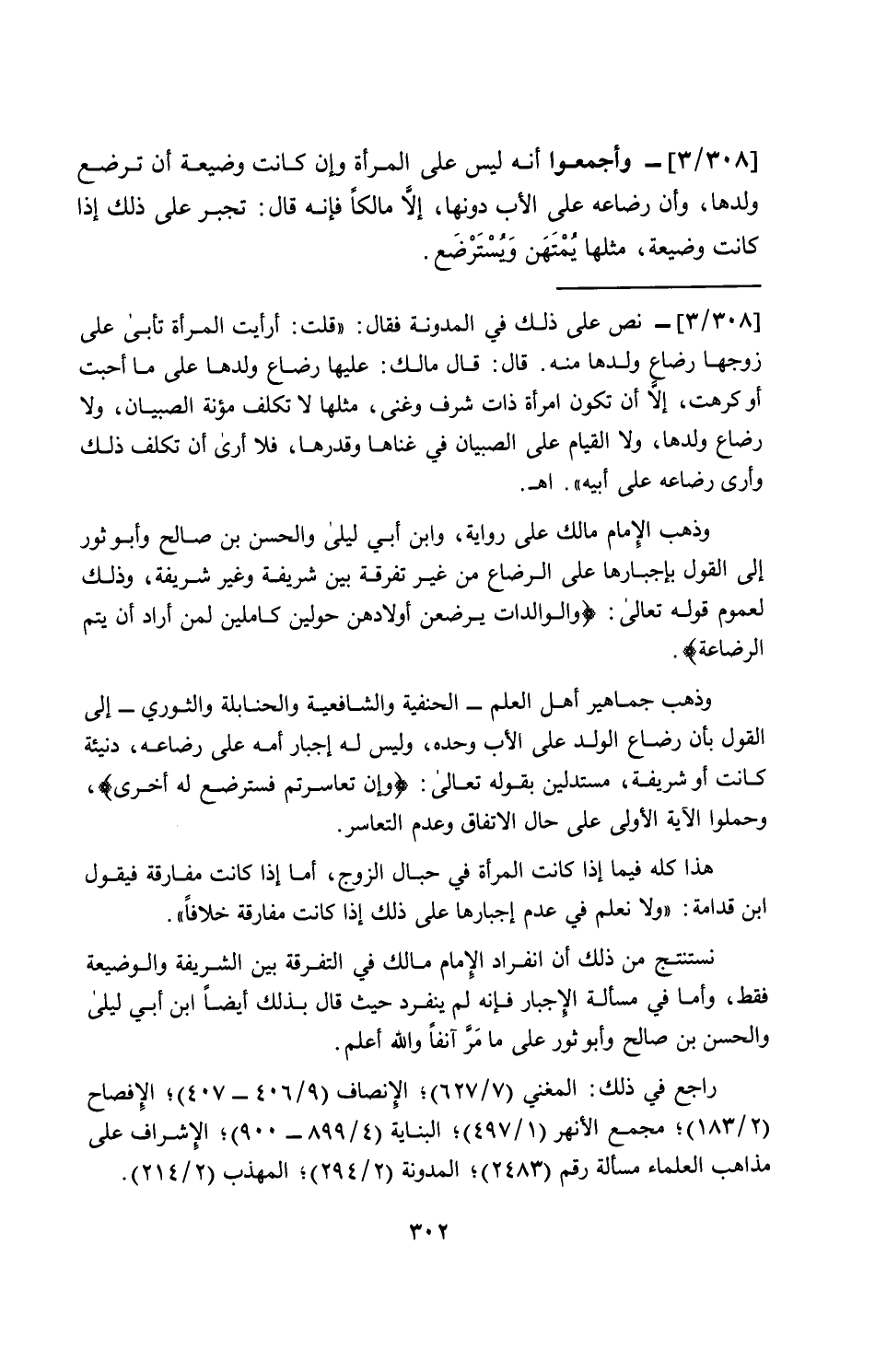 [308/ 3]- وأجمعوا أنه ليس على المرأة وإن كانت وضيعة أن ترضع ولدها، وأن رضاعه على الأب دونها، إلاَّ مالكاً فإنه قال: تجبر على ذلك إذا كانت وضيعة، مثلها يُمْتَهَن وَيُسْتَرْضَع.