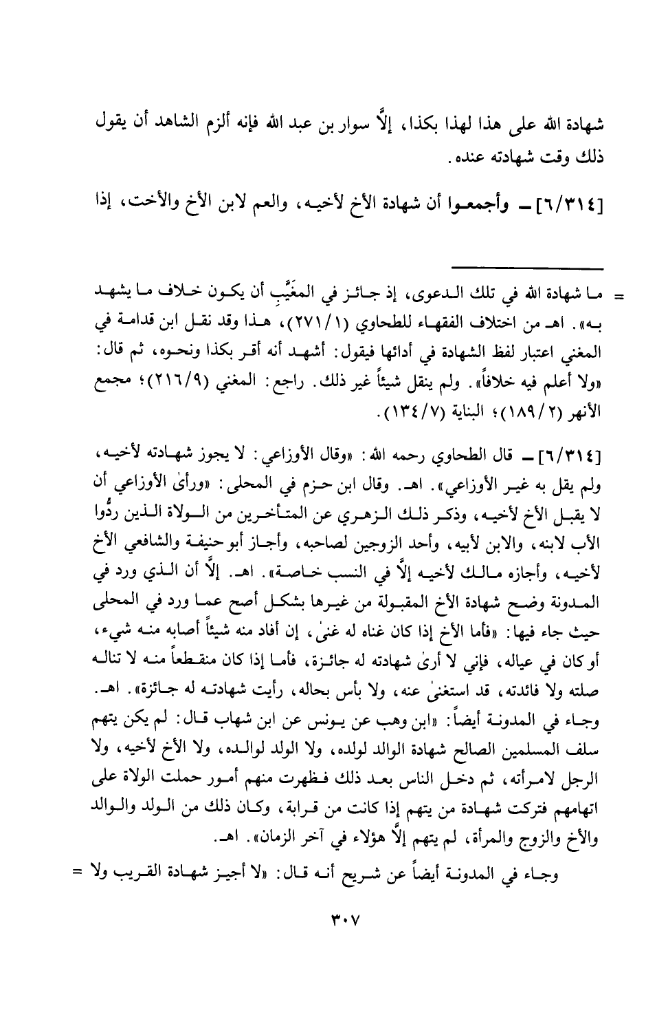 [314/ 6]- وأجمعوا أن شهادة الأخ لأخيه، والعم لابن الأخ والأخت، إذا