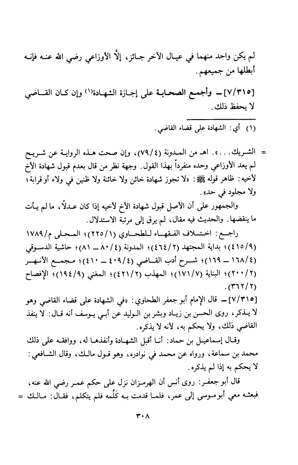 [315/ 7]- وأجمع الصحابة على إجازة الشهادة وإن كان القاضي لا يحفظ ذلك.