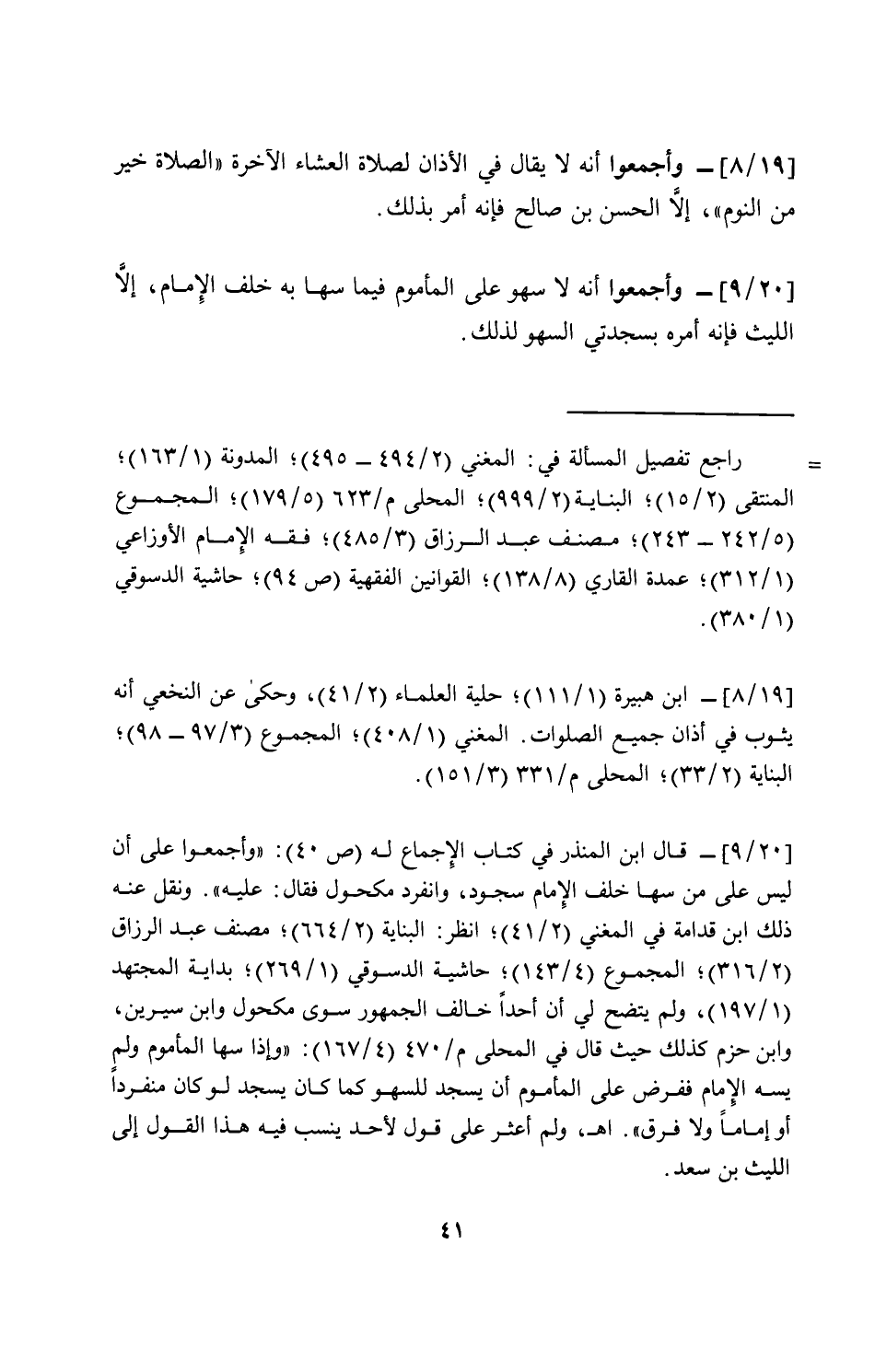 [20/ 9]- وأجمعوا أنه لا سهو على المأموم فيما سها به خلف الإمام, إلّا الليث فإنه أمره بسجدتي السهو لذلك.