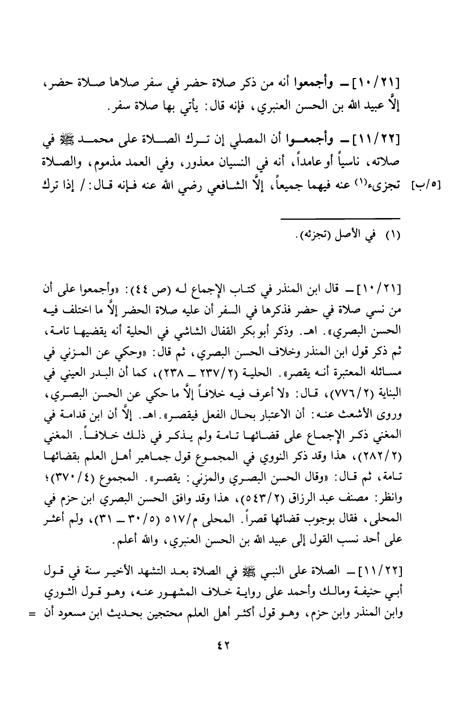 [21/ 10]- وأجمعوا أنه من ذكر صلاة حضر في سفر صلاها صلاة حضر, إلا عبيد الله بن الحسن العنبري, فإنه قال: يأتي بها صلاة سفر.