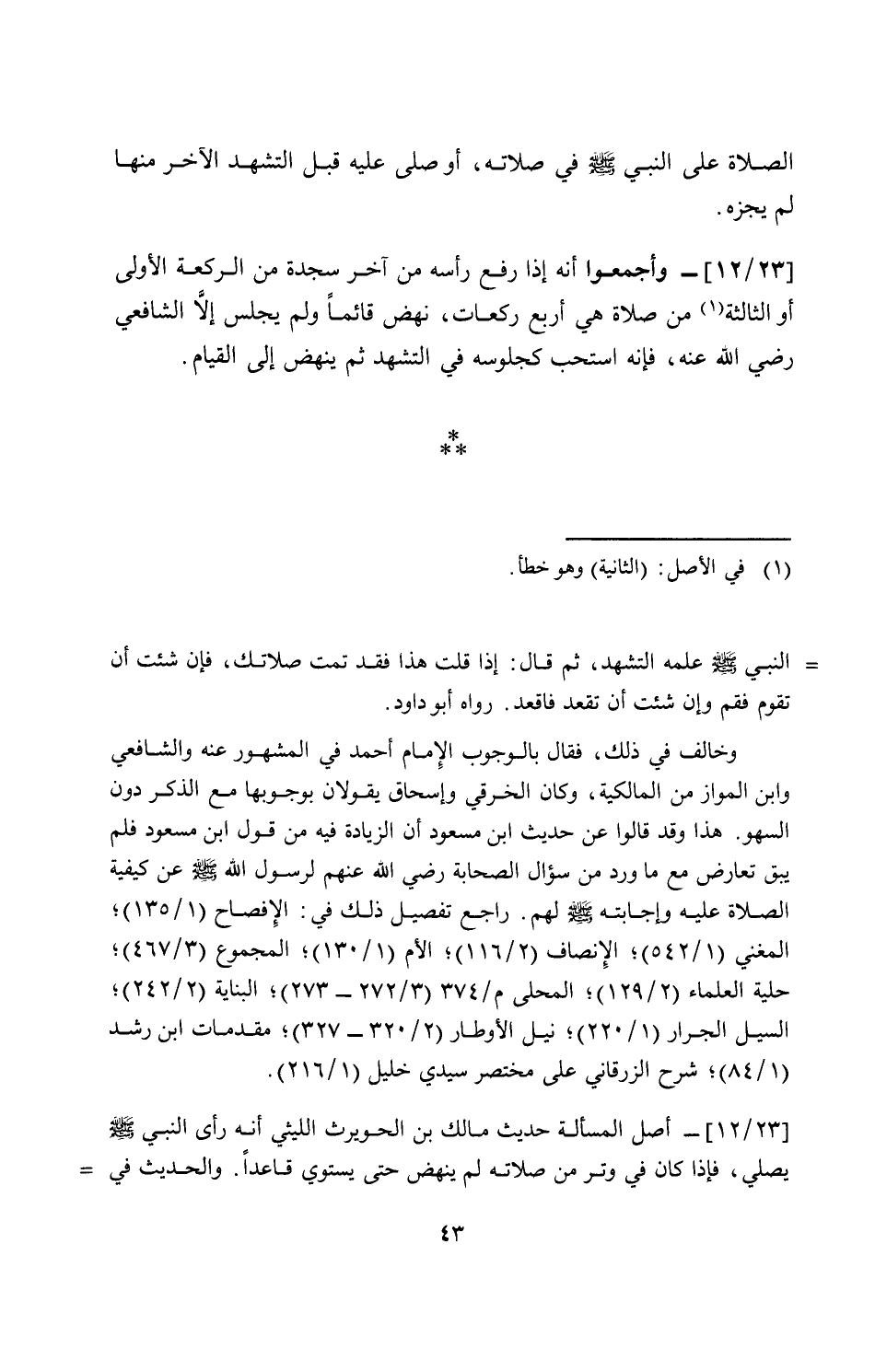 [23/ 12]- وأجمعوا أنه إذا رفع رأسه من آخر سجدة من الركعة الأولى أو الثالثة من صلاة هي أربع ركعات من صلاة هي أربع ركعات, نهض قائمًا ولم يجلس إلّا الشافعي رضي الله عنه, فإنه استحب كجلوسه في التشهد ثم ينهض إلى القيام.