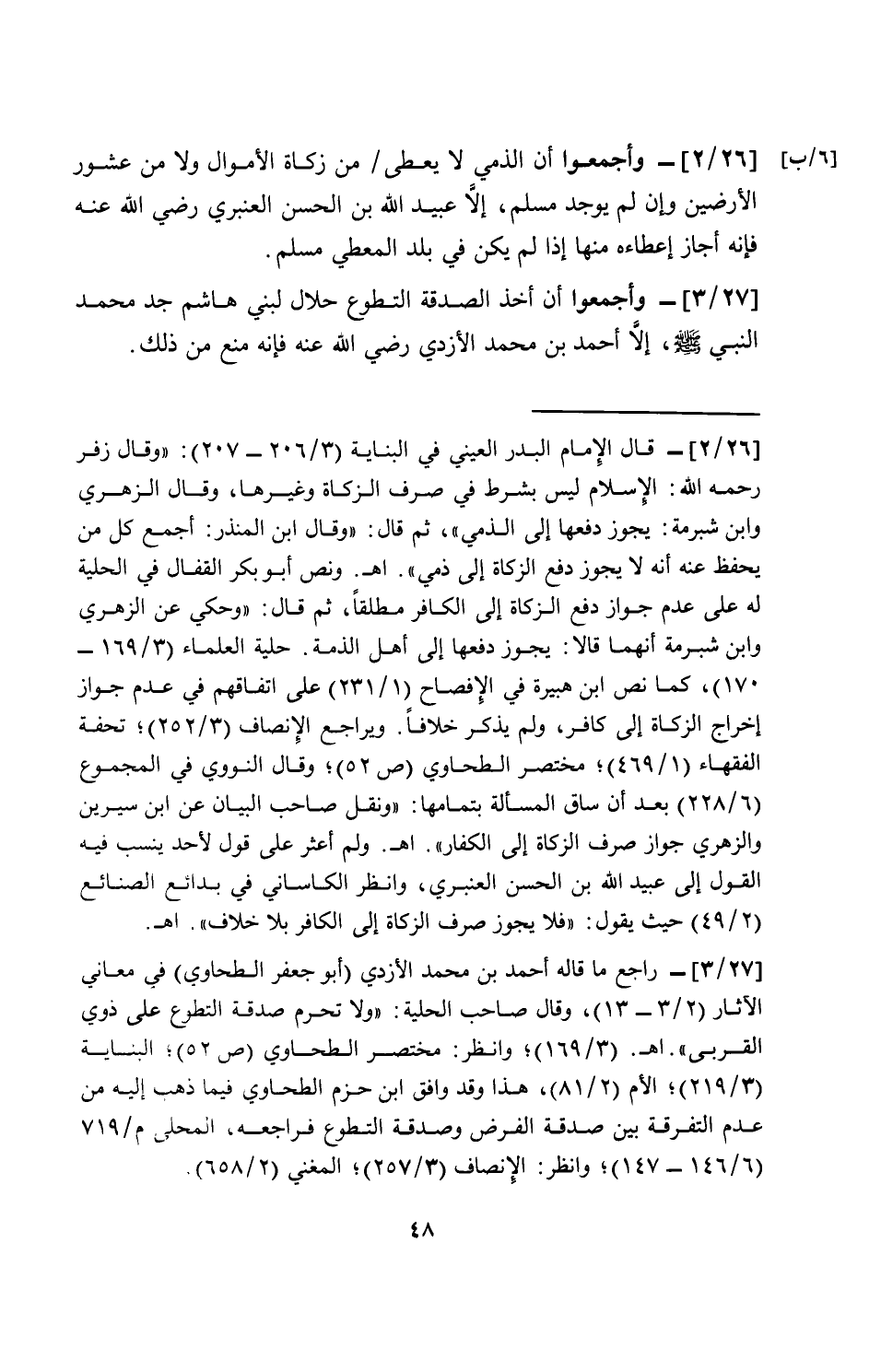 [26/ 2]- وأجمعوا أن الذمي لا يعطى / من زكاة الأموال ولا من عشور الأرضين وإن لم يوجد مسلم, إلّا عبيد الله بن الحسن العنبري رضي الله عنه فإنه أجاز إعطاءه منها إذا لم يكن في البلد المعطي مسلم.
