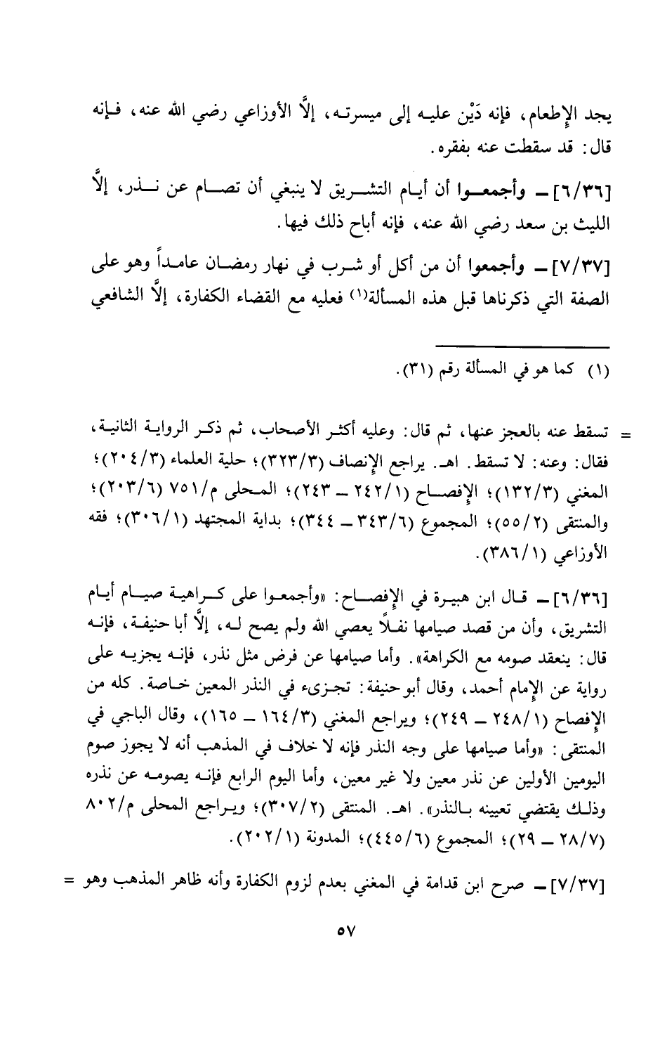 [36/ 6]- وأجمعوا أن أيام التشريق لا ينبغي أن تصام عن نذر, إلّا الليث بن سعد رضي الله عنه, فإنه أباح ذلك فيها.