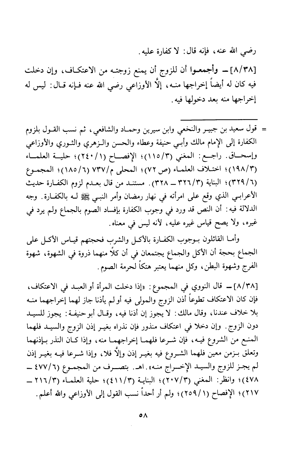 [38/ 8]- وأجمعوا أن للزوج أن يمنع زوجته من الاعتكاف, وإن دخلت فيه كان له أيضًا إخراجها منه, إلّا الأوزاعي رضي الله عنه فإنه قال: ليس له إخراجها منه بعد دخولها فيه.