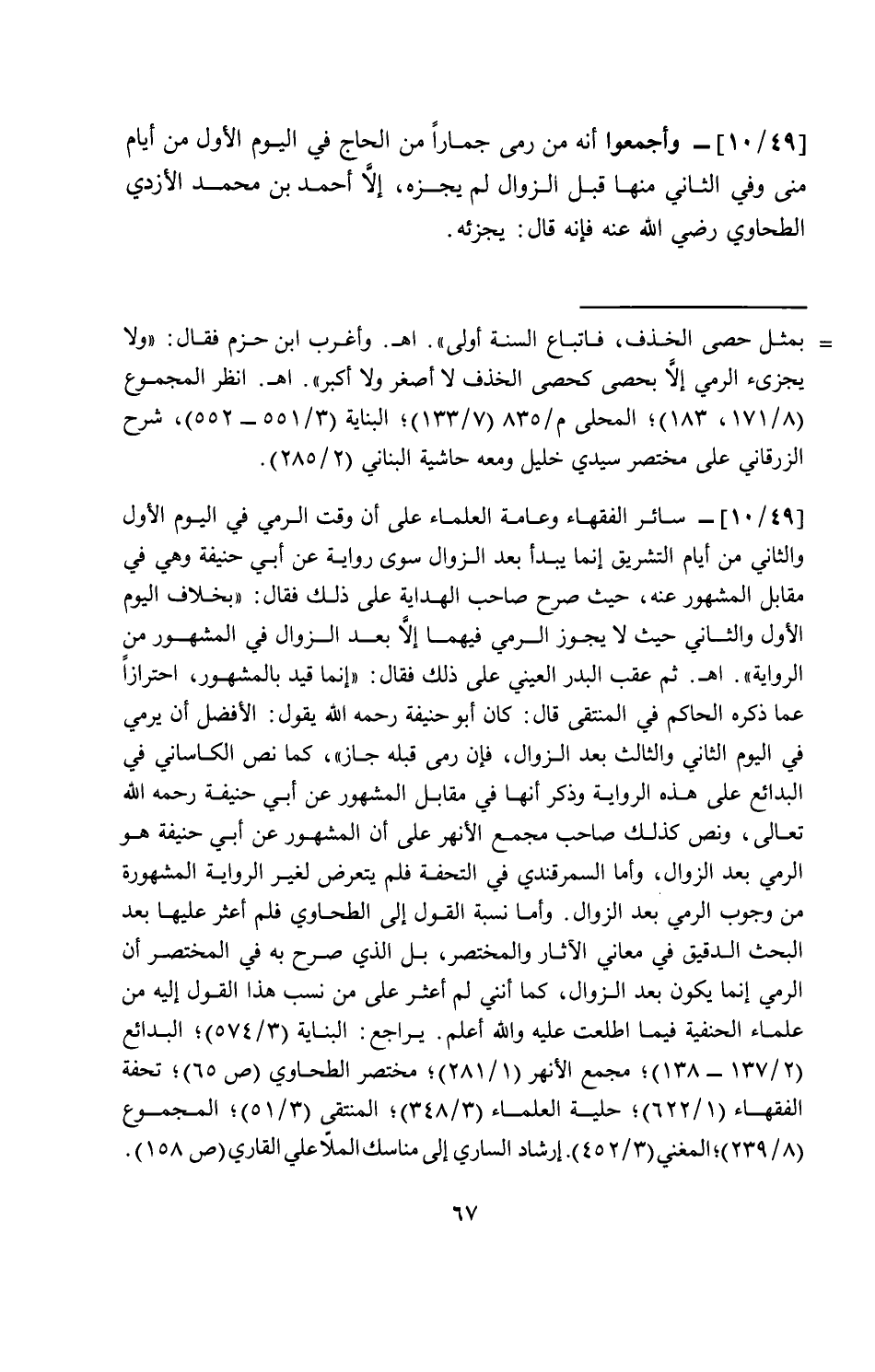 [49/ 10]-وأجمعوا أنه من رمى جماراً من الحاج في اليوم الأول من أيام منى وفي الثاني منها قبل الزوال لم يجزه، إلا أحمد بن محمد الأزدي الطحاوي رضي الله عنه فإنه قال: يجزئه.