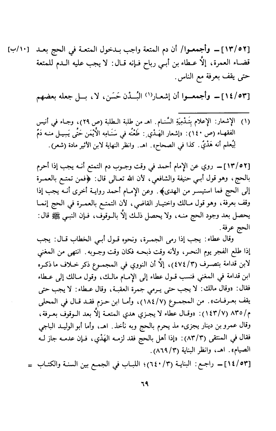 [52/ 14]-وأجمعوا/ أن دم المتعة واجب بدخول المتعة في الجمعة بعد قضاء العمرة، إلا عطاء بن أبي رباح فإنه قال: لا يجب عليه الدم للمتعة حتى يقف بعرفة مع الناس.