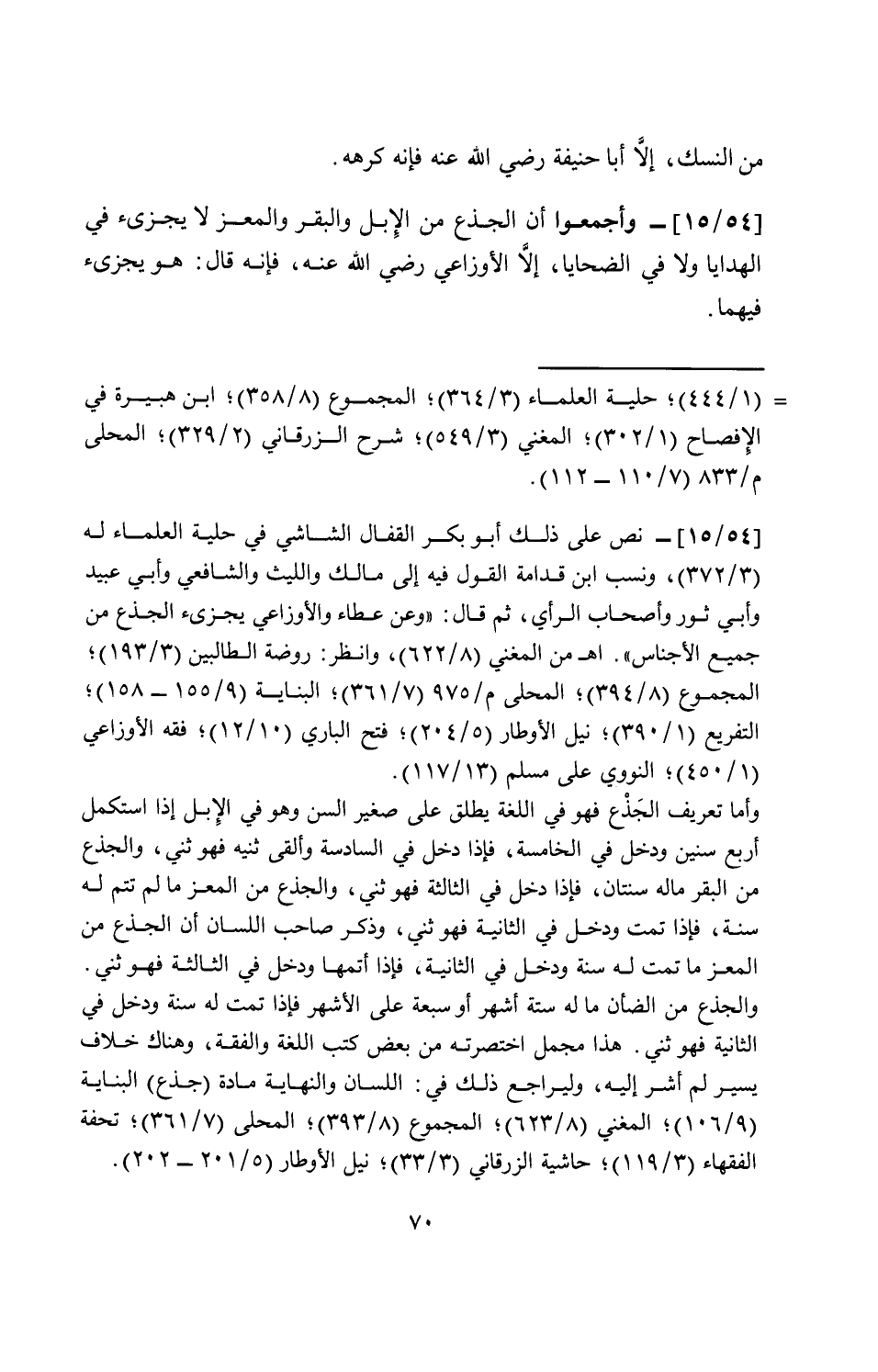 [54/ 15]-وأجمعوا أن الجذع من الإبل والبقر والمعز لا يجزئ في الهدايا ولا في الضحايا، إلا الأوزاعي رضي الله عنه، فإنه قال: هو يجزئ فيهما.