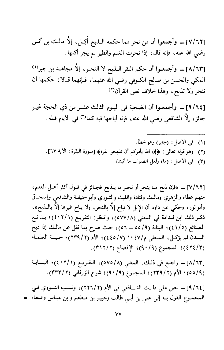[63/ 8]-وأجمعوا أن حكم البقر الذبح لا النحر، إلا مجاهد بن جبر المكي والحسن بن صالح الكوفي رضي الله عنهما، فإنهما قالا: حكمها أن تنحر ولا تذبح، وهذا خلاف نص القرآن.