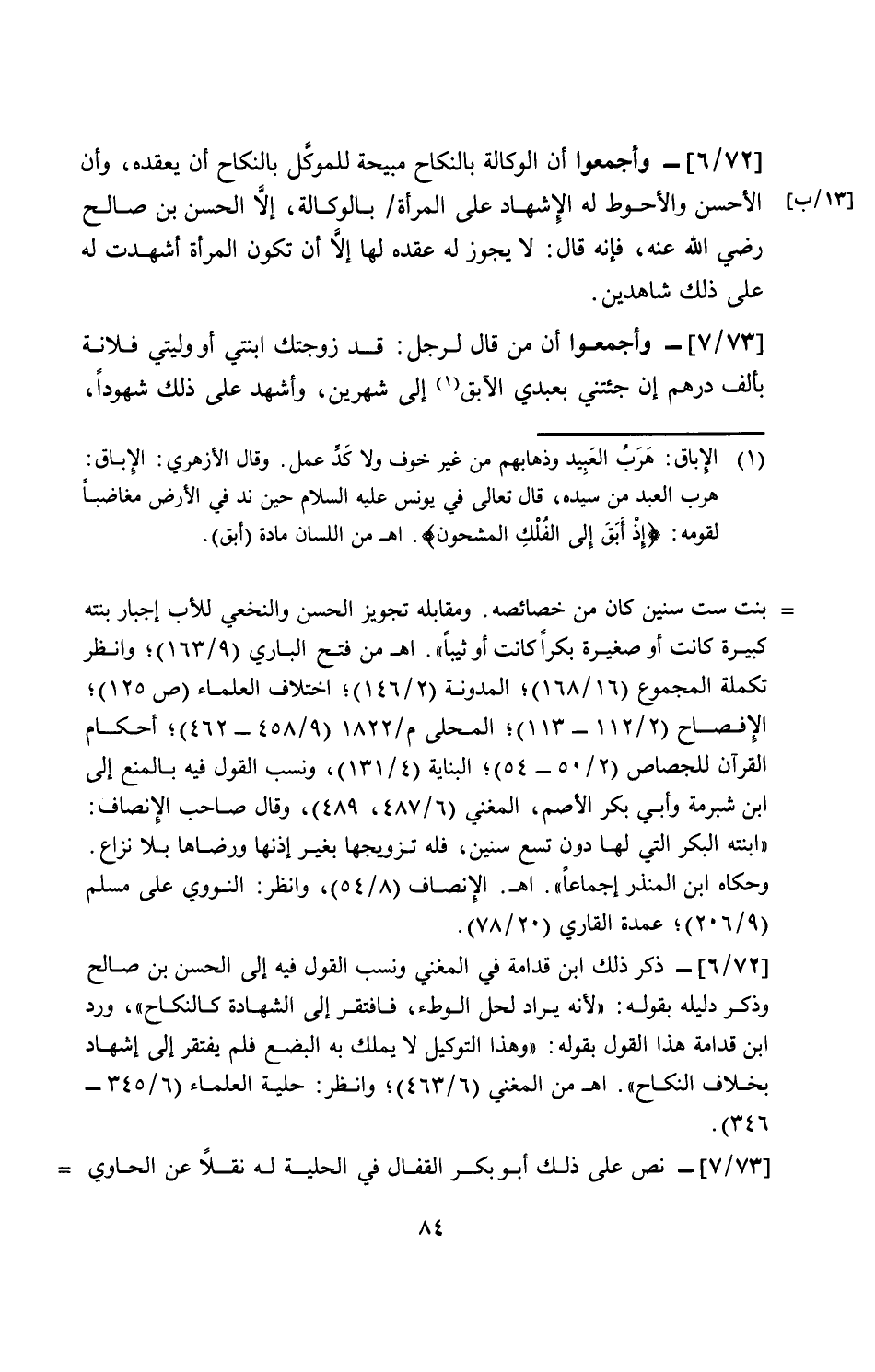 [72/ 6]-وأجمعوا أن الوكالة بالنكاح مبيحة للموكّل بالنكاح أن يعقده، وأن الأحسن والأحوط له الإشهاد على المرأة/ بالوكالة، إلا الحسن بن صالح رضي الله عنه، فإنه قال: لا يجوز له عقدة لها إلا أن تكون المرأة أشهدت له على ذلك شاهدين.