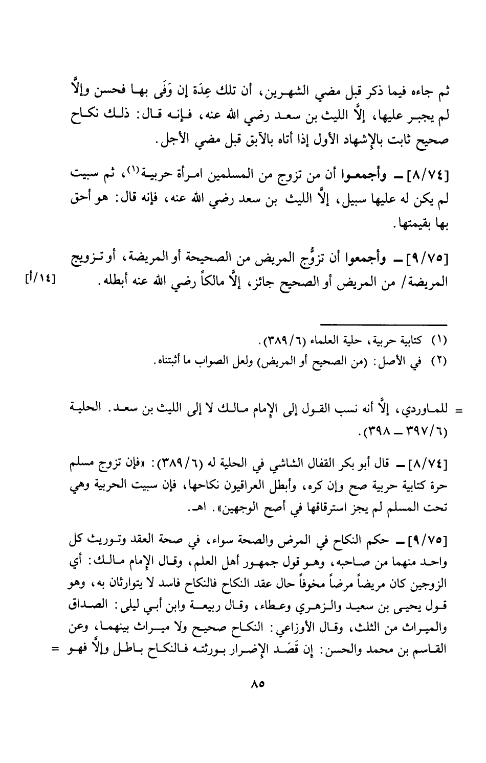 [74/ 8]-وأجمعوا أن من تزوج من المسلين امرأة حربية، ثم سبيت لم يكن له عليها سبيل، إلا الليث بن سعد رضي الله عنه، فإنه قال: هو أحق بها بقيمتها.