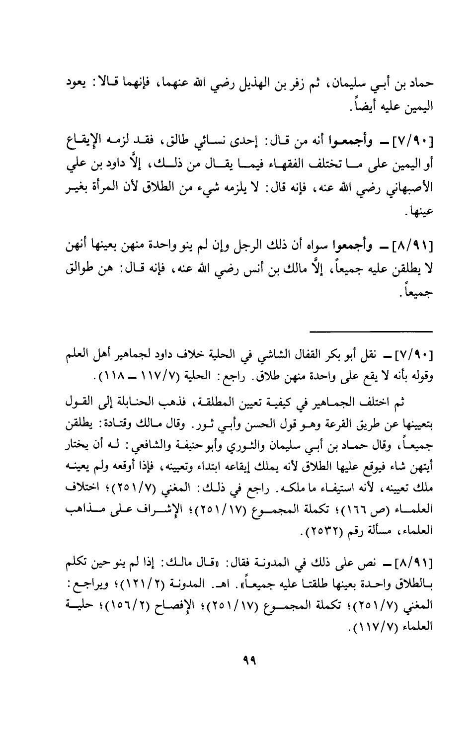 [91/ 8]-وأجمعوا سواء أن ذلك الرجل وإن لم ينو واحدة منهن بعينها أنهن لا يطلقن عليه جميعاً، إلا مالك بن أنس رضي الله عنه، فإنه قال: هن طوالق جميعاً.