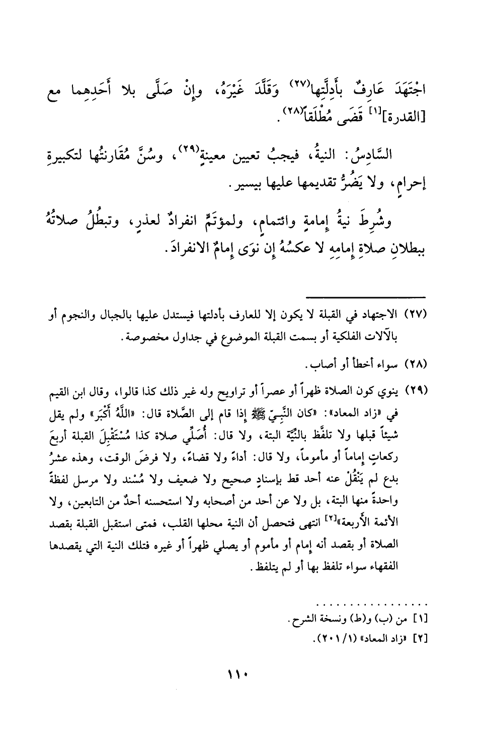 السَّادِس النِّيَّة فَيجب تعْيين مُعينَة وَسن مقارنتها لتكبيرة احرام وَلَا يضر تَقْدِيمهَا عَلَيْهَا بِيَسِير