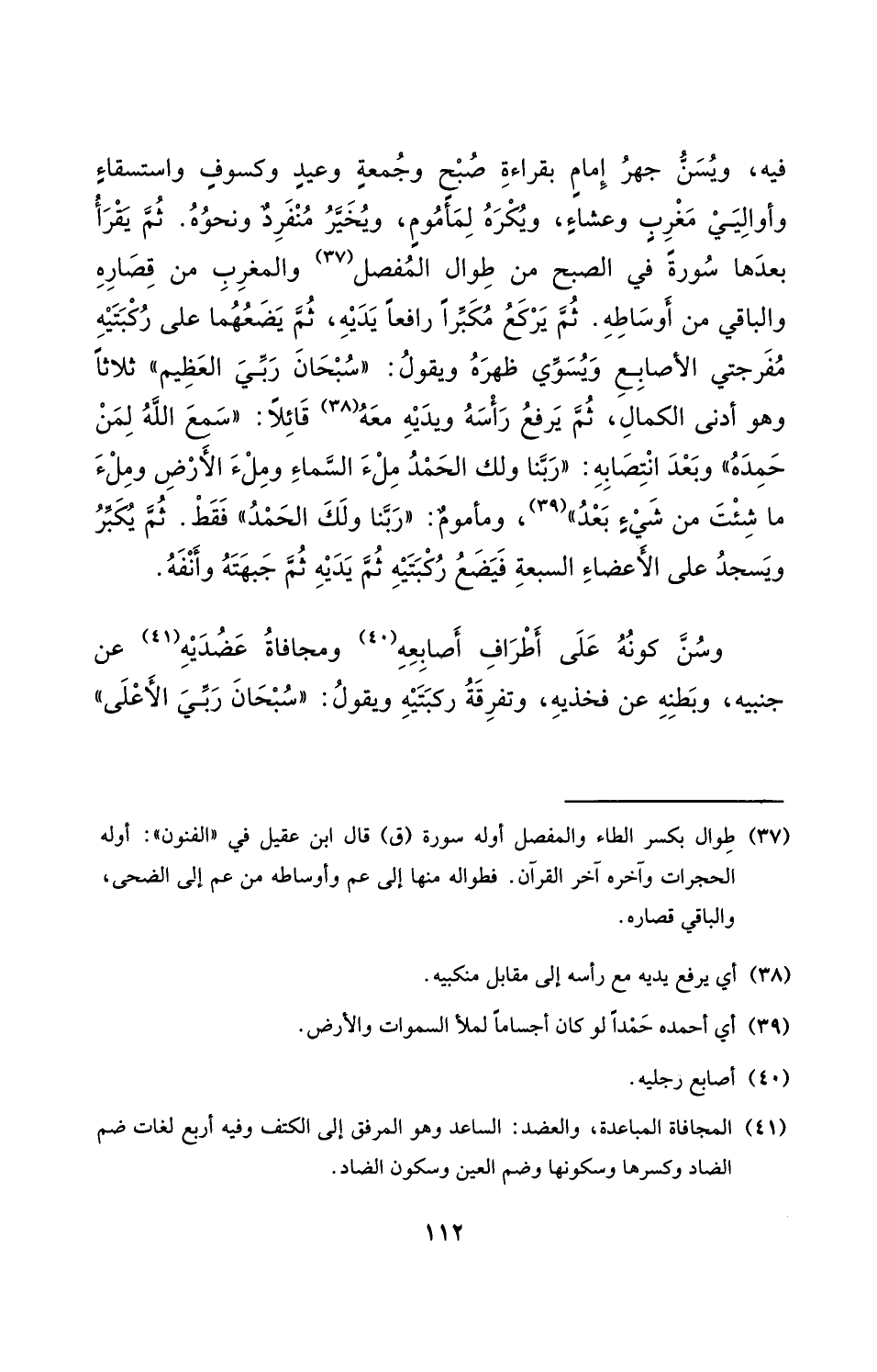 فِيهِ وَيسن جهر إِمَام بِقِرَاءَة صبح وجمعة وَعِيد وكسوف واستسقاء واواليي مغرب وعشاء وَيكرهُ لماموم وَيُخَير مُنْفَرد وَنَحْوه ثمَّ يقرا بعْدهَا سُورَة فِي الصُّبْح من طوال الْمفصل وَالْمغْرب من قصاره وَالْبَاقِي من اوساطه ثمَّ يرْكَع مكبرا رَافعا يَدَيْهِ ثمَّ يضعهما على رُكْبَتَيْهِ مفرجتي الاصابع وَيُسَوِّي ظَهره وَيَقُول سُبْحَانَ رَبِّي الْعَظِيم ثَلَاثًا وَهُوَ ادنى الْكَمَال ثمَّ يرفع راسه وَيَديه مَعًا قائلاسمع الله لمن حمدا وَبعده رَبنَا وَلَك الْحَمد وَبعد انتصابه رَبنَا وَلَك الْحَمد ملْء السَّمَاء وملء الأَرْض وملء مَا شِئْت من شَيْء بعد وماموم رَبنَا وَلَك الْحَمد فَقَط ثمَّ يكبر وَيسْجد على الاعضاء السَّبْعَة فَيَضَع رُكْبَتَيْهِ ثمَّ يَدَيْهِ ثمَّ جَبهته وانفه