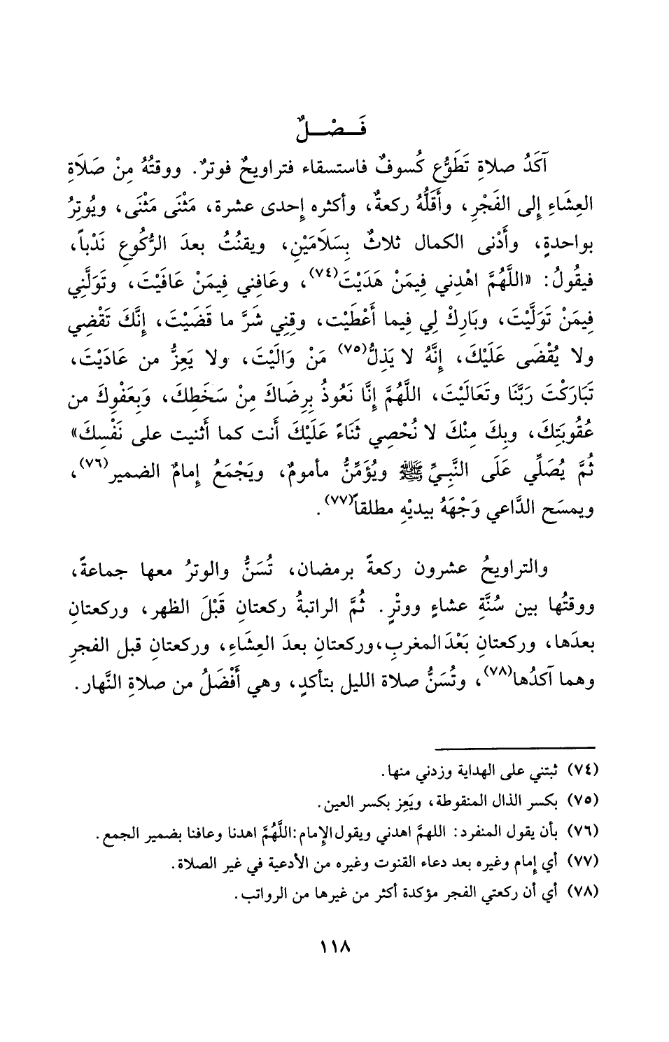 اكد صَلَاة تطوع كسوف فاستسقاء فتراويح فوتر وَوَقته من صَلَاة الْعشَاء الى الْفجْر واقله رَكْعَة واكثره احدى عشرَة مثنى مثنى ويوتر بِوَاحِدَة وادنى الْكَمَال ثَلَاث بسلامين ويقنت بعد الرُّكُوع ندبا فَيَقُول اللَّهُمَّ اهدني فِيمَن هديت وَعَافنِي فِيمَن عافيت وتولني فِيمَن توليت وَبَارك لي فِيمَا اعطيت وقني شَرّ مَا قضيت انك تقضي وَلَا يقْضى عَلَيْك انه لَا يذل من واليت وَلَا يعز من عاديت تَبَارَكت رَبنَا وَتَعَالَيْت اللَّهُمَّ انا نَعُوذ برضاك من سخطك وبعفوك من عُقُوبَتك وَبِك مِنْك لَا نحصي ثَنَاء عَلَيْك انت كَمَا اثنيت على نَفسك ثمَّ يُصَلِّي على النَّبِي صلى الله عَلَيْهِ وَسلم ويؤمن ماموم وَيجمع امام الضَّمِير وَيمْسَح الدَّاعِي وَجهه بيدَيْهِ مُطلقًا