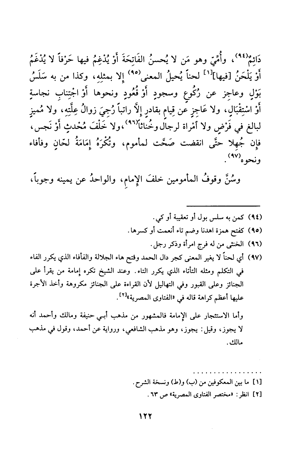 دَائِم وامي وَهُوَ من لَا يحسن الْفَاتِحَة اَوْ يدغم فِيهَا حرفا لَا يدغم اَوْ يلحن فِيهَا لحنا يحِيل الْمَعْنى الا بِمثلِهِ وَكَذَا من بِهِ سَلس بَوْل وعاجز عَن رُكُوع وَسُجُود اَوْ عَن قعُود وَنَحْوهَا اواجتناب نَجَاسَة اَوْ اسْتِقْبَال وَلَا عَاجز عَن قيام بِقَادِر الا راتبا رُجي زَوَال علته وَلَا مُمَيّز لبالغ فِي فرض وَلَا امراة لرجال وخناثا وَلَا خلف مُحدث اَوْ نجس فَأن جهلا حَتَّى انْقَضتْ صحت لمأموم وَتكره امامة لحان وفأفاء وَنَحْوه