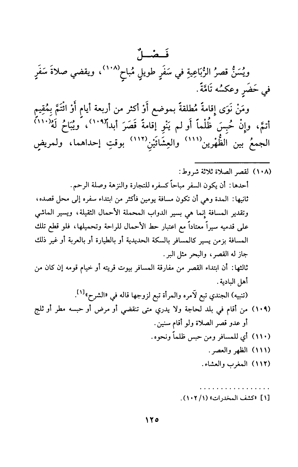 وَمن نوى اقامة مُطلقَة بموقع اَوْ اكثر من اربعة ايام اَوْ ائتم بمقيم اتم وان حبس ظلما اَوْ لم ينْو اقامة قصر ابدا وَيُبَاح لَهُ الْجمع بَين الظهرين اَوْ العشائين بِوَقْت احداهما ولمريض