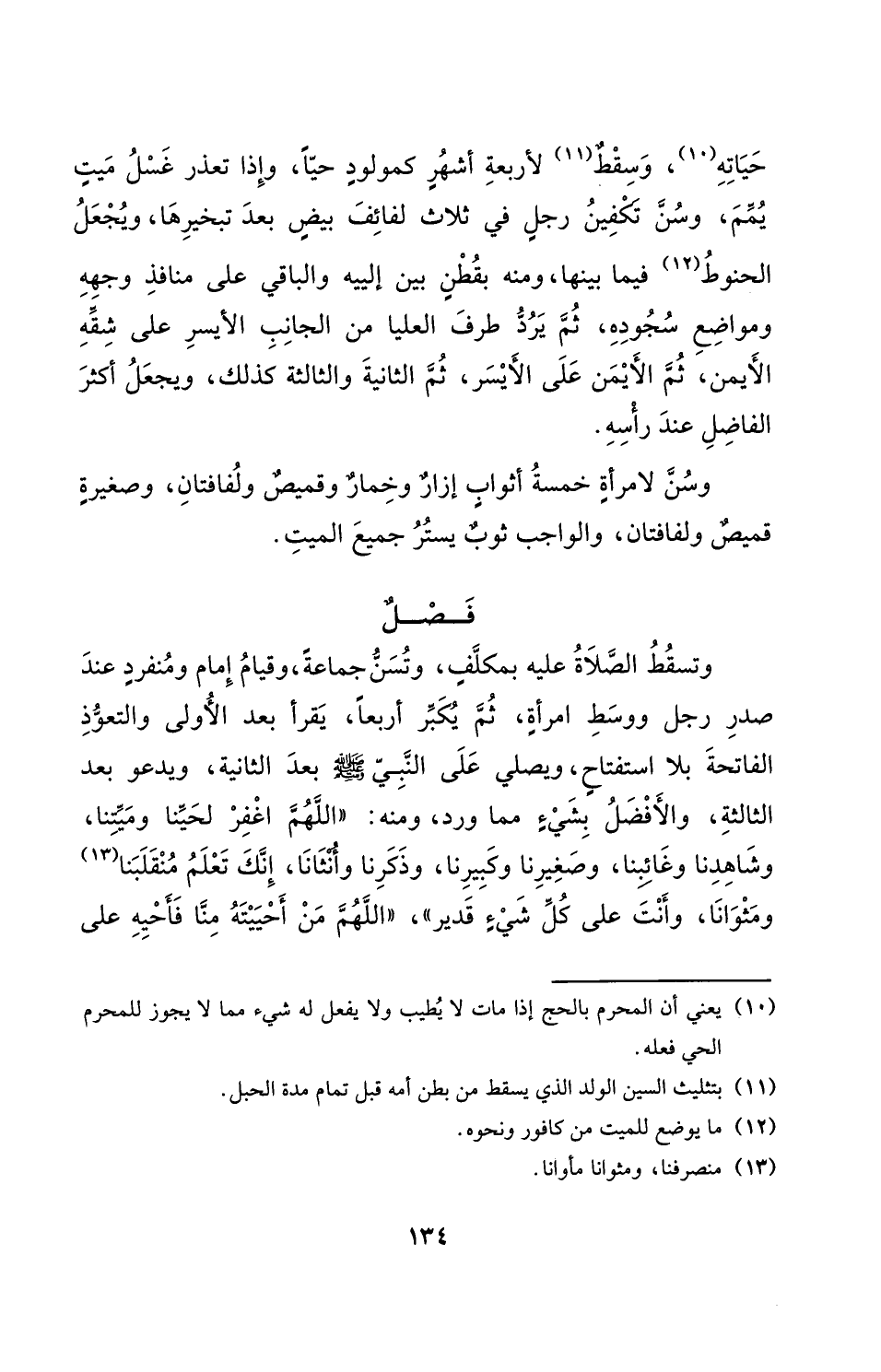 وَتسقط الصَّلَاة عَلَيْهِ بمكلف وَتسن جمَاعَة وَقيام امام ومنفرد عِنْد صدر رجل ووسط امراة ثمَّ يكبر اربعا يقرا بعد الاولى والتعوذ الْفَاتِحَة بِلَا استفتاح وَيُصلي على النَّبِي صلى الله عَلَيْهِ وَسلم بعد الثَّانِيَة وَيَدْعُو بعد الثَّالِثَة والافضل بِشَيْء مِمَّا ورد وَمِنْه اللَّهُمَّ اغْفِر لحينا وميتنا وشاهدنا وغائبنا وصغيرنا وَكَبِيرنَا وَذكرنَا وانثانا انك تعلم منقلبنا ومثوانا وانت على كل شَيْء قدير اللَّهُمَّ من احييته منا فاحيه على