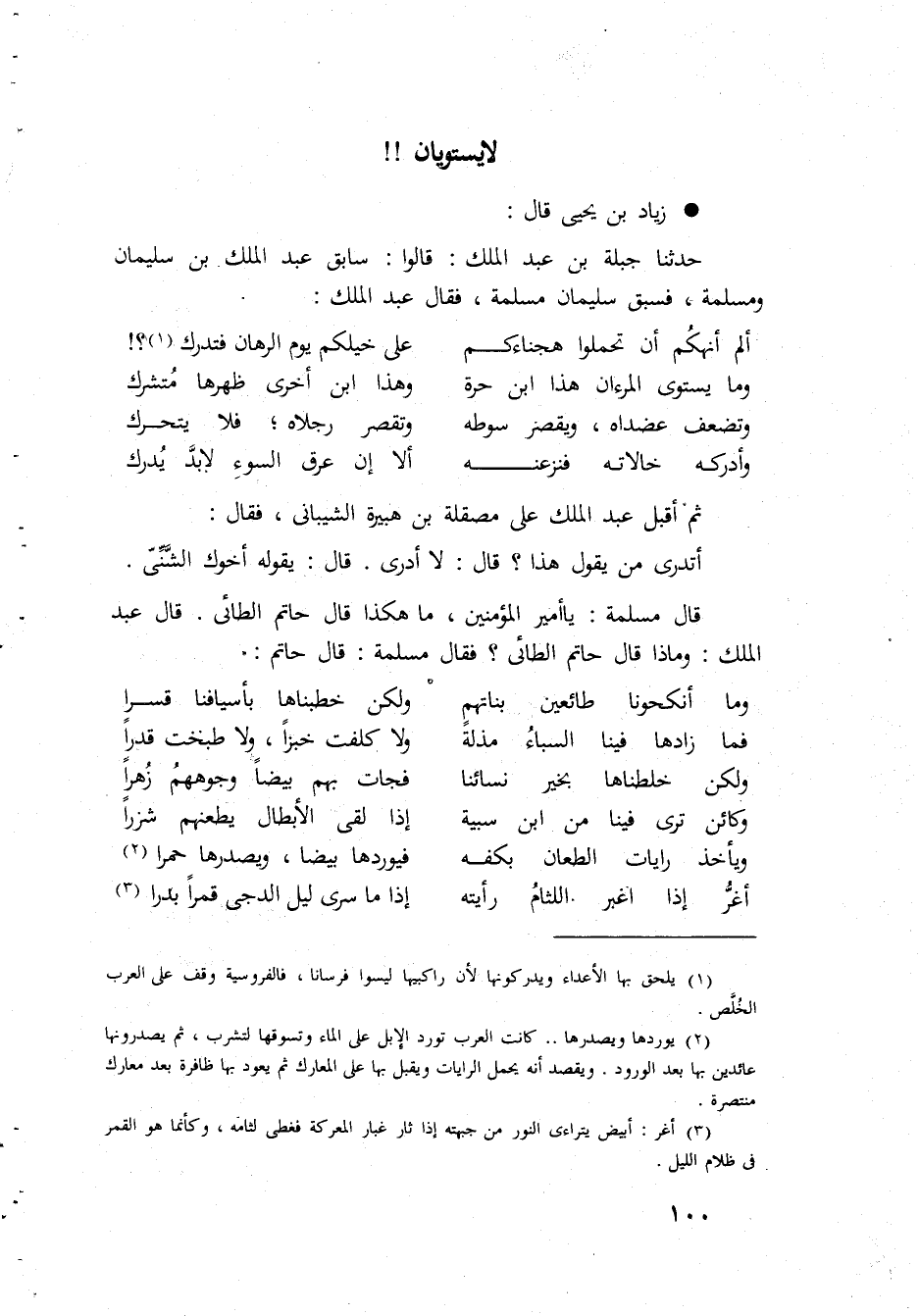 لَا يستويان زِيَاد بن يحيى قَالَ حَدثنَا جبلة بن عبد الْملك قَالُوا سَابق عبد الْملك بن سُلَيْمَان ومسلمة فَسبق سُلَيْمَان مسلمة فَقَالَ عبد الْملك ألم أنهكم أَن تحملوا هجناءكم على خيلكم يَوْم الرِّهَان فتدرك وَمَا يستوى المرءان هَذَا ابْن حرَّة وَهَذَا ابْن أُخْرَى ظهرهَا متشرك وتضعف عضداه وَيقصر سَوْطه وتقصر رِجْلَاهُ فَلَا يَتَحَرَّك وأدركه خالاته فنزعنه أَلا إِن عرق السوء لَا بُد يدْرك ثمَّ أقبل عبد امللك على مصقلة بن هُبَيْرَة الشَّيْبَانِيّ فَقَالَ أَتَدْرِي من يَقُول هَذَا قَالَ لَا أَدْرِي قَالَ يَقُوله أَخُوك الشني قَالَ مسلمة يَا أَمِير الْمُؤمنِينَ مَا هَكَذَا قَالَ حَاتِم الطَّائِي قَالَ عبد الْملك وماذا قَالَ حَاتِم الطَّائِي فَقَالَ مسلمة قَالَ حَاتِم وَمَا أنكحونا طائعين بناتهم وَلَكِن خطبناها بأسيافنا قسرا فَمَا زَادهَا فِينَا السباء مذلة وَلَا كلفت خبْزًا وَلَا طبخت قدرا وَلَكِن خلطناها بِخَير نسائنا فجات بهم بيضًا وُجُوههم زهرا وكائن ترى فِينَا من ابْن سبية إِذا لقى الْأَبْطَال يطعنهم شزرا وَيَأْخُذ رايات الطعان بكفه فيوردها بيضًا ويصدرها حمرا أغر إِذا اغبر اللثام رَأَيْته إِذا مَا سرى ليل الدجى قمرا بَدْرًا