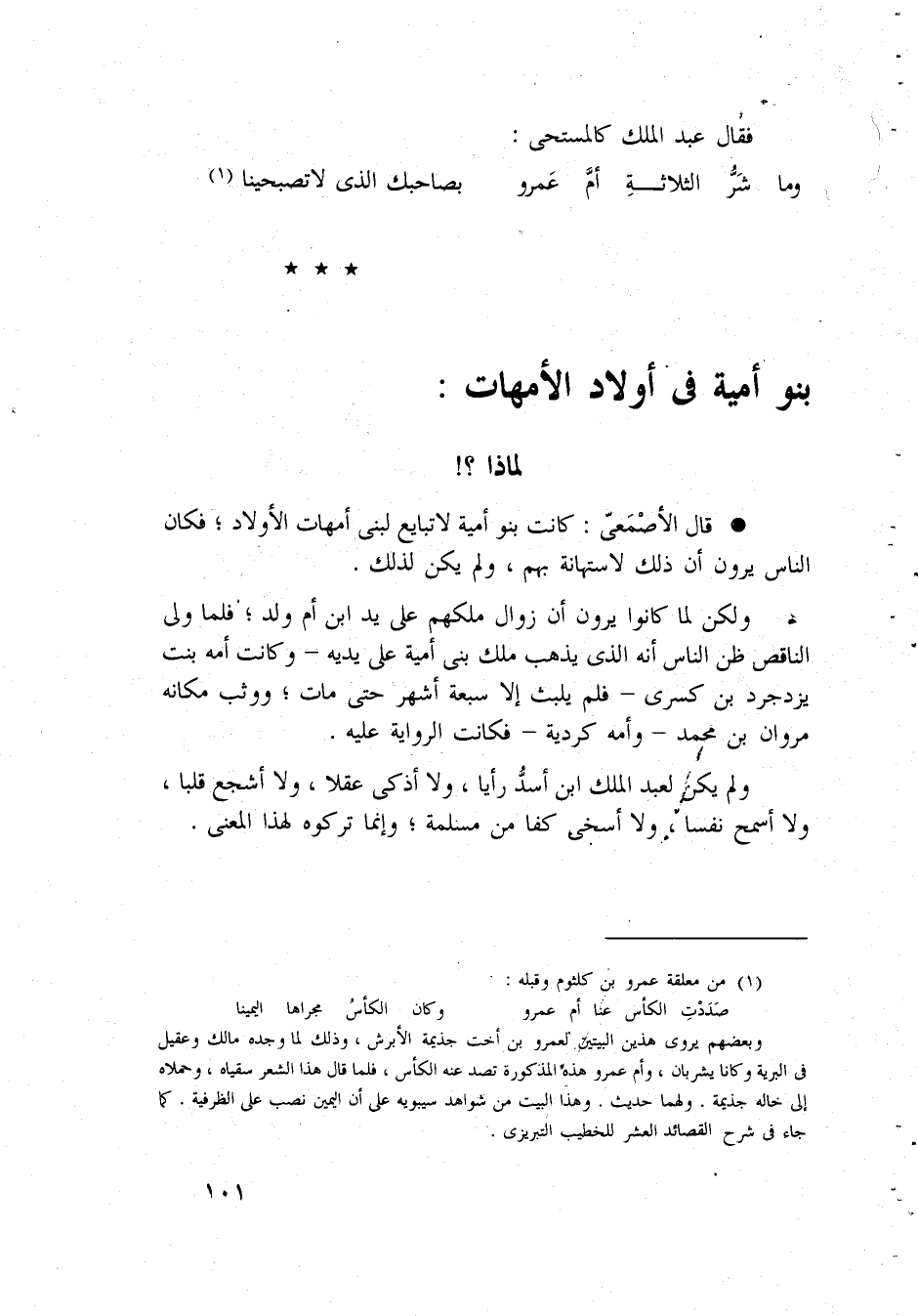 فَقَالَ عبد الْملك كالمستحي وَمَا شَرّ الثَّلَاثَة أم عَمْرو بصاحبك الذى لَا تصبحينا بَنو أُميَّة فِي أَوْلَاد الْأُمَّهَات لماذا قَالَ الْأَصْمَعِي كَانَت بَنو أُميَّة لَا تبَايع لبنى أُمَّهَات الْأَوْلَاد فَكَانَ النَّاس يرَوْنَ أَن ذَلِك لاستهانة بهم وَلم يكن لذَلِك وَلَكِن لما كَانُوا يرَوْنَ أَن زَوَال ملكهم على يَد ابْن أم ولد فَلَمَّا ولى النَّاقِص ظن النَّاس أَنه الذى يذهب ملك بنى أُميَّة على يَدَيْهِ وَكَانَت أمه بنت يزدجرد بن كسْرَى فَلم يلبث إِلَّا سَبْعَة أشهر حَتَّى مَاتَ ووثب مَكَانَهُ مَرْوَان بن مُحَمَّد وَأمه كردية فَكَانَت الرِّوَايَة عَلَيْهِ وَلم يكن لعبد الْملك ابْن أَسد رَأيا وَلَا أذكى عقلا وَلَا أَشْجَع قلبا وَلَا أسمح نفسا وَلَا أسخى كفا من مسلمة وَإِنَّمَا تَرَكُوهُ لهَذَا الْمَعْنى