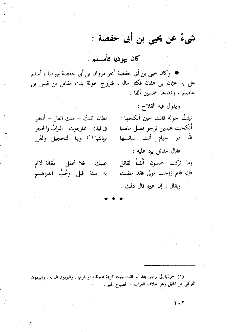 شَيْء عَن يحيى بن ابي حَفْصَة كَانَ يَهُودِيّا فَأسلم وَكَانَ يحي بن أبي حَفْصَة أَخُو مَرْوَان بن أبي حَفْصَة يَهُودِيّا أسلم على يَد عُثْمَان بن عَفَّان فَكثر مَاله فَتزَوج خَوْلَة بنت مقَاتل بن قيس بن عَاصِم ونقدها خمسين ألفا وَيَقُول فِيهِ القلاخ نبئت خَوْلَة قَالَت حِين أنْكحهَا لطالما كنت مِنْك الْعَار أنْتَظر أنكحت عَبْدَيْنِ ترجو فضل مَالهمَا فِي فِيك مِمَّا رَجَوْت التُّرَاب وَالْحجر لله در جِيَاد أَنْت سائسها برذنتها وَبهَا التحجيل وَالْغرر فَقَالَ مقَاتل يرد عَلَيْهِ وَمَا تركت خَمْسُونَ ألفا لقَائِل عَلَيْك فَلَا تحفل مقَالَة لائم فَإِن قُلْتُمْ زوجت مولى فقد مَضَت بِهِ سنة قبلي وَحب الدَّرَاهِم وَيُقَال إِن غَيره قَالَ ذَلِك
