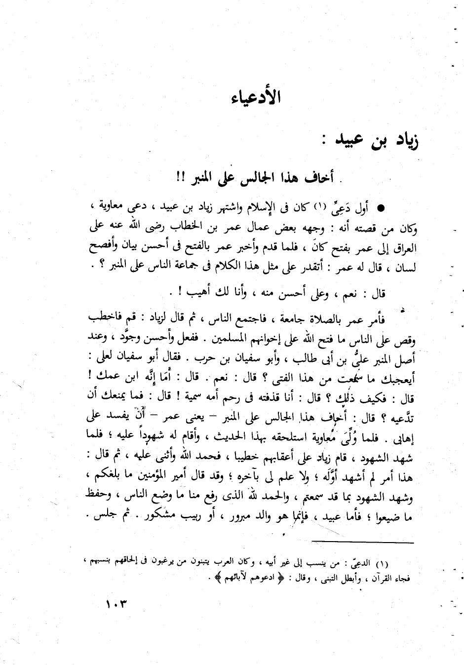 الأدعياء زِيَاد بن عبيد أَخَاف هَذَا الْجَالِس على الْمِنْبَر أول دعِي كَانَ فِي الْإِسْلَام واشتهر زِيَاد بن عبيد دعى مُعَاوِيَة وَكَانَ من قصَّته أَنه وَجهه بعض عُمَّال عمر بن الْخطاب رَضِي الله عَنهُ على الْعرَاق إِلَى عمر بِفَتْح كَانَ فَلَمَّا قدم وَأخْبر عمر بِالْفَتْح فِي أحسن بَيَان وأفصح لِسَان قَالَ لَهُ عمر أتقدر على مثل هَذَا الْكَلَام فِي جمَاعَة النَّاس على الْمِنْبَر قَالَ نعم وعَلى أحسن مِنْهُ وَأَنا لَك أهيب فَأمر عمر بِالصَّلَاةِ جَامِعَة فَاجْتمع النَّاس ثمَّ قَالَ لزياد قُم فاخطب وقص على النَّاس مَا فتح الله على إخْوَانهمْ الْمُسلمين فَفعل وَأحسن وجود وَعند أصل الْمِنْبَر على بن أبي طَالب وَأَبُو سُفْيَان بن حَرْب فَقَالَ أَبُو سُفْيَان لعَلي أيعجبك من سَمِعت من هَذَا الْفَتى قَالَ نعم قَالَ أما إِنَّه ابْن عمك قَالَ فَكيف ذَلِك قَالَ أَنا قَذَفته فِي رحم أمه سميَّة قَالَ فَمَا يمنعك أَن تدعيه قَالَ أَخَاف هَذَا الْجَالِس على الْمِنْبَر يَعْنِي عمر أَن يفْسد على إهابي فَلَمَّا ولى مُعَاوِيَة اسْتَلْحقهُ بِهَذَا الحَدِيث وَأقَام لَهُ شُهُودًا عَلَيْهِ فَلَمَّا شهد الشُّهُود قَامَ زِيَاد على أَعْقَابهم خَطِيبًا فَحَمدَ الله وأثني عَلَيْهِ ثمَّ قَالَ قَالَ أَمِير الْمُؤمنِينَ مَا بَلغَكُمْ وَشهد الشُّهُود بِمَا قد سَمِعْتُمْ وَالْحَمْد لله الَّذِي رفع منا مَا وضع النَّاس وَحفظ مَا ضيعوا فَأَما عبيد فَإِنَّمَا هُوَ وَالِد مبرور أَو ربيب مشكور ثمَّ جلس