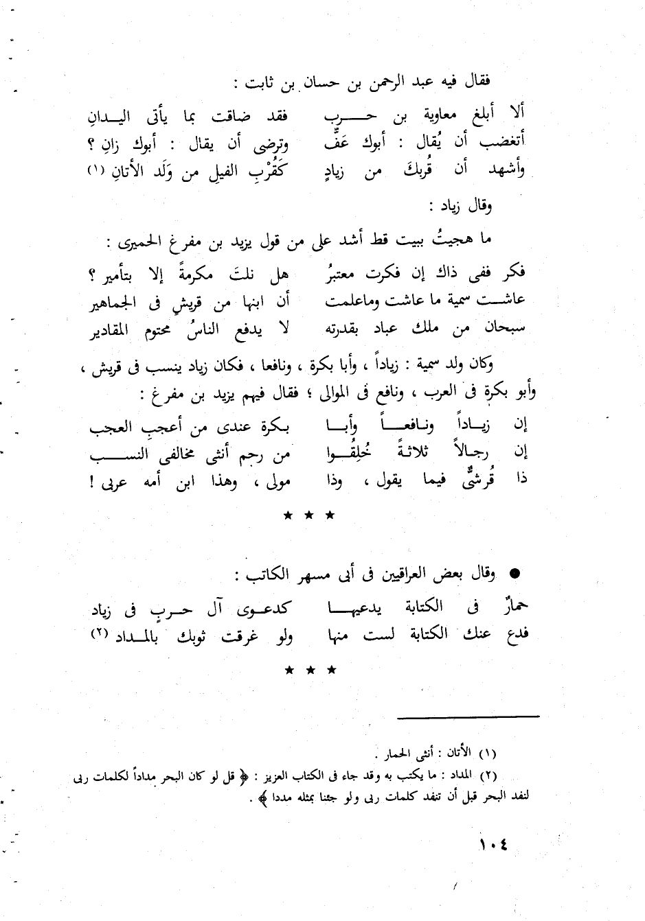 فَقَالَ فِيهِ عبد الرَّحْمَن بن حسان بن ثَابت أَلا أبلغ مُعَاوِيَة بن حَرْب فقد ضَاقَتْ بِمَا يَأْتِي اليدان أتغضب أَن يُقَال أَبوك عف وترضى أَن يُقَال أَبوك زَان وَأشْهد أَن قربك من زِيَاد كقرب الْفِيل من ولد الأتان وَقَالَ زِيَاد مَا هجيت بِبَيْت قطّ على قَول انشد على من قَول يزِيد بن مفرغ الْحِمْيَرِي فكر فَفِي ذَاك إِن فَكرت مُعْتَبر هَل نلْت مكرمَة إِلَّا بتأمير عاشت سميَّة مَا عاشت وَمَا علمت أَن ابْنهَا من قُرَيْش فِي الجماهير سُبْحَانَ من ملك عباد بقدرته لَا يدْفع النَّاس محتوم الْمَقَادِير وَكَانَ ولد سميَّة زيادا وَأَبا بكرَة ونافعا فَكَانَ زِيَاد ينْسب فِي قُرَيْش وَأَبُو بكرَة فِي الْعَرَب وَنَافِع فِي الموَالِي فَقَالَ فيهم يزِيد بن مفرغ إِن زيادا ونافعا وَأَبا بكرَة عِنْدِي من أعجب الْعجب إِن رجَالًا ثَلَاثَة خلقُوا من رحم أُنْثَى مخالفي النّسَب ذَا قرشي فِيمَا يَقُول وَذَا مولى وَهَذَا ابْن أمه عَرَبِيّ وَقَالَ بعض الْعِرَاقِيّين فِي أبي مسْهر الْكَاتِب حمَار فِي الْكِتَابَة يدعيها كدعوى آل حَرْب فِي زِيَاد فدع عَنْك الْكِتَابَة لست مِنْهَا وَلَو غرقت ثَوْبك بالمداد
