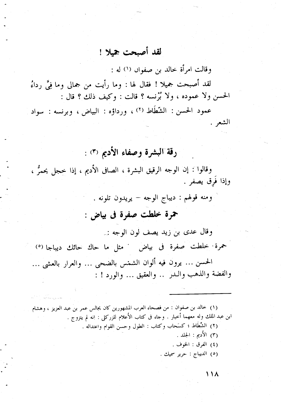 لقد أَصبَحت جميلا وَقَالَت امْرَأَة خَالِد بن صَفْوَان لَهُ لقد أَصبَحت جميلا فَقَالَ لَهَا وَمَا رَأَيْت من جمالى وَمَا فى رِدَاء الْحسن وَلَا عموده وَلَا برنسه قَالَت وَكَيف ذَلِك قَالَ عَمُود الْحسن الشطاط وَرِدَاؤُهُ الْبيَاض وبرنسه سَواد الشّعْر رقة الْبشرَة وصفاء الْأَدِيم وَقَالُوا إِن الْوَجْه الرَّقِيق الْبشرَة الصافى الْأَدِيم إِذا خجل يحمر وَإِذا فرق يصفر وَمِنْه قَوْلهم ديباج الْوَجْه يُرِيدُونَ تلونه حمرَة خلطت صفرَة فى بَيَاض وَقَالَ عدى بن زيد يصف لون الْوَجْه حمرَة خلطت صفرَة فى بَيَاض مثل مَا حاك حائك ديباجا الْحسن يرَوْنَ فِيهِ ألوان الشَّمْس بالضحى والعرار بالعشى وَالْفِضَّة وَالذَّهَب والدر والعقيق والورد