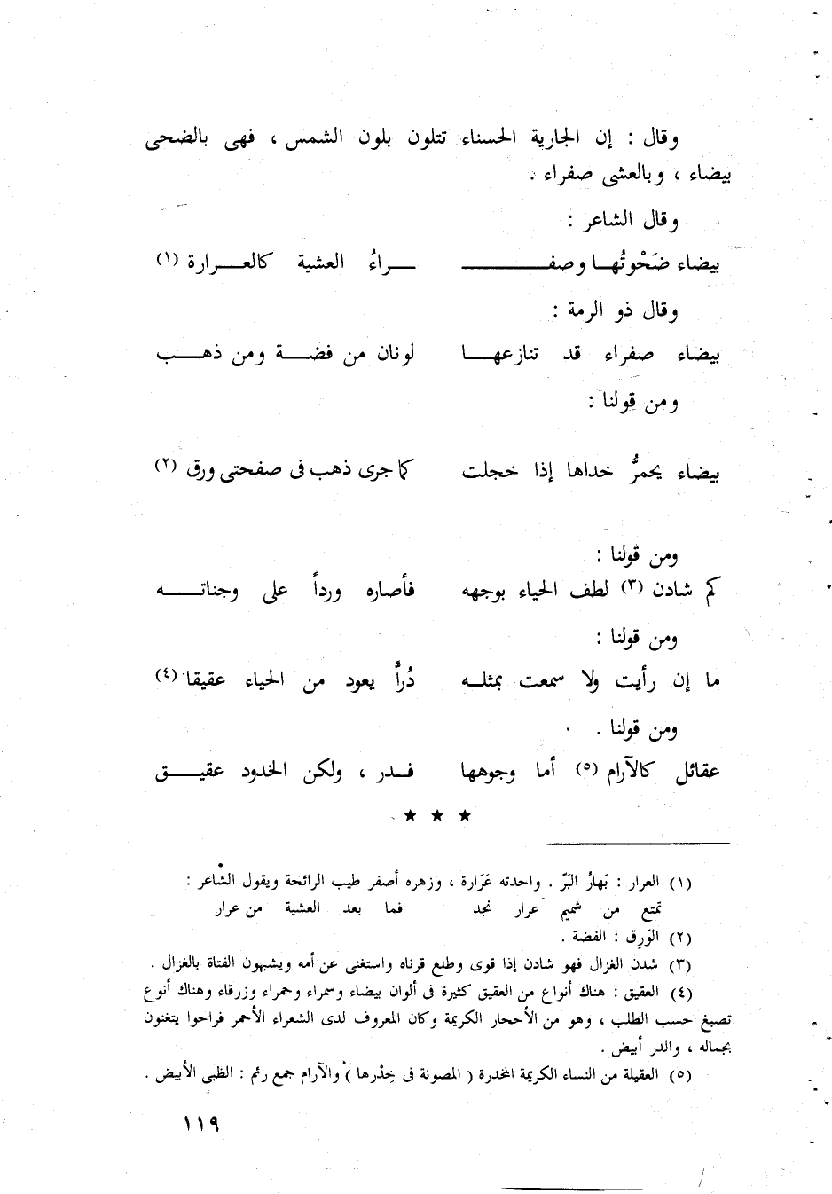 وَقَالَ إِن الْجَارِيَة الْحَسْنَاء تتلون بلون الشَّمْس فَهِيَ بالضحى بَيْضَاء وبالعشى صفراء وَقَالَ الشَّاعِر بَيْضَاء ضحوتها وصف رَاء العشية كالعرارة وَقَالَ ذُو الرمة بَيْضَاء صفراء قد تنازعها لونان من فضَّة وَمن ذهب وَمن قَوْلنَا بَيْضَاء يحمر خداها إِذا خجلت كَمَا جرى ذهب فى صفحتى ورق وَمن قَوْلنَا كم شادن لطف الْحيَاء بوحهه فأصاره وردا على وجناته وَمن قَوْلنَا مَا إِن رَأَيْت وَلَا سَمِعت بِمثلِهِ درا يعود من الْحيَاء عقيقا وَمن قَوْلنَا عقائل كالآرام أما وجوهها فدر وَلَكِن الخدود عقيق