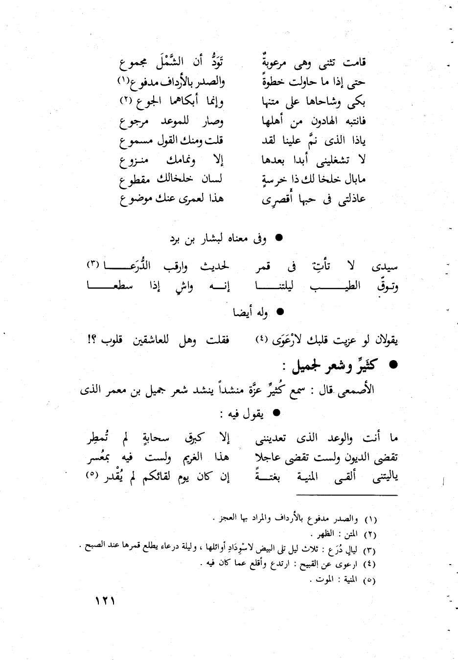 قَامَت تثنى وهى مرعوبة تود أَن الشمل مَجْمُوع حَتَّى إِذا مَا حاولت خطْوَة والصدر بالأرداف مَدْفُوع بَكَى وشاحاها على متنها وَإِنَّمَا أبكاهما الْجُوع فانتبه الهادون من أَهلهَا وَصَارَ للموعد مرجوع يَا ذَا الذى نم علينا لقد قلت ومنك القَوْل مسموع لَا تشغلينى أبدا بعْدهَا إِلَّا ونمامك منزوع مَا بَال خلخالك ذَا خرسة لِسَان خلخالك مَقْطُوع عاذلتى فى حبها أقصرى هَذَا لعمرى عَنْك مَوْضُوع وَفِي مَعْنَاهُ لبشار بن برد سَيِّدي لَا تأت فى قمر لحَدِيث وارقب الدرعا وتوق الطّيب ليلتنا إِنَّه واش إِذا سطعا وَله أَيْضا يَقُولَانِ لَو عزيت قَلْبك لارعوى فَقلت وَهل للعاشقين قُلُوب كثير وَشعر لجميل الْأَصْمَعِي قَالَ سمع كثير عزة منشدا ينشد شعر جميل بن معمر الَّذِي يَقُول فِيهِ مَا أَنْت والوعد الَّذِي تعديننى إِلَّا كبرق سَحَابَة لم تمطر تقضى الدُّيُون وَلست تقضى عَاجلا هَذَا الْغَرِيم وَلست فِيهِ بمعسر يَا لَيْتَني ألْقى الْمنية بَغْتَة إِن كَانَ يَوْم لقائكم لم يقدر