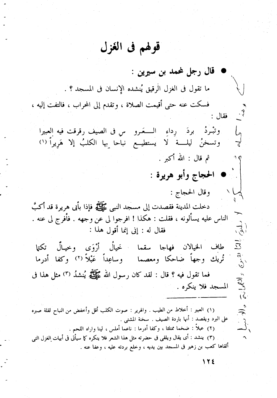 قَوْلهم فى الْغَزل قَالَ ردل لحمد بن سِيرِين مَا تَقول فِي الْغَزل الرَّقِيق ينشده الْإِنْسَان فى الْمَسْجِد فَسكت عَنهُ حَتَّى أُقِيمَت الصَّلَاة وَتقدم إِلَى الْمِحْرَاب فَالْتَفت إِلَيْهِ فَقَالَ وتبرد برد رِدَاء العرو س فى الصَّيف رقرقت فِيهِ العبيرا وتسخن لَيْلَة لَا يَسْتَطِيع نباحا بهَا الْكَلْب إِلَّا هريرا ثمَّ قَالَ الله أكبر الْحجَّاج وَأَبُو هُرَيْرَة وَقَالَ الْحجَّاج دخلت الْمَدِينَة فقصدت إِلَى مَسْجِد النَّبِي فَإِذا بِأبي هُرَيْرَة قد أكب النَّاس عَلَيْهِ يسألونه فَقلت هَكَذَا افرجوا لى عَن وَجهه فأفرج لى عَنهُ فَقَالَ لَهُ أَنى إِنَّمَا أَقُول هَذَا طَاف الخيالان فهاجا سقما خيال أروى وخيال تكتما تريك وَجها ضَاحِكا ومعصما وساعدا عبلا وكفا أدرما فَمَا تَقول فِيهِ قَالَ لقد كَانَ رَسُول الله ينشد مثل هَذَا فى الْمَسْجِد فَلَا يُنكره
