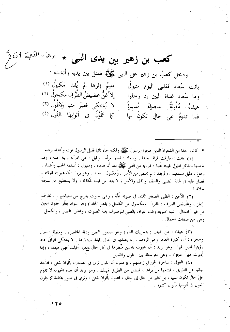 كَعْب بن زُهَيْر بَين يَدي النَّبِي وَدخل كَعْب بن زُهَيْر على النَّبِي فَمثل بَين يَدَيْهِ وأنشده بَانَتْ سعاد فقلبي الْيَوْم متبول متيم إثْرهَا لم يفد مكبول وَمَا سعاد غَدَاة الْبَين إِذْ رحلوا إِلَّا أغن غضيض الطّرف مَكْحُول هيفاء مقبلة عجزاء مُدبرَة لَا يشتكى قصر مِنْهَا وَلَا طول فَمَا تدوم على حَال تكون بهَا كَمَا تلون فى أثوابها الغول