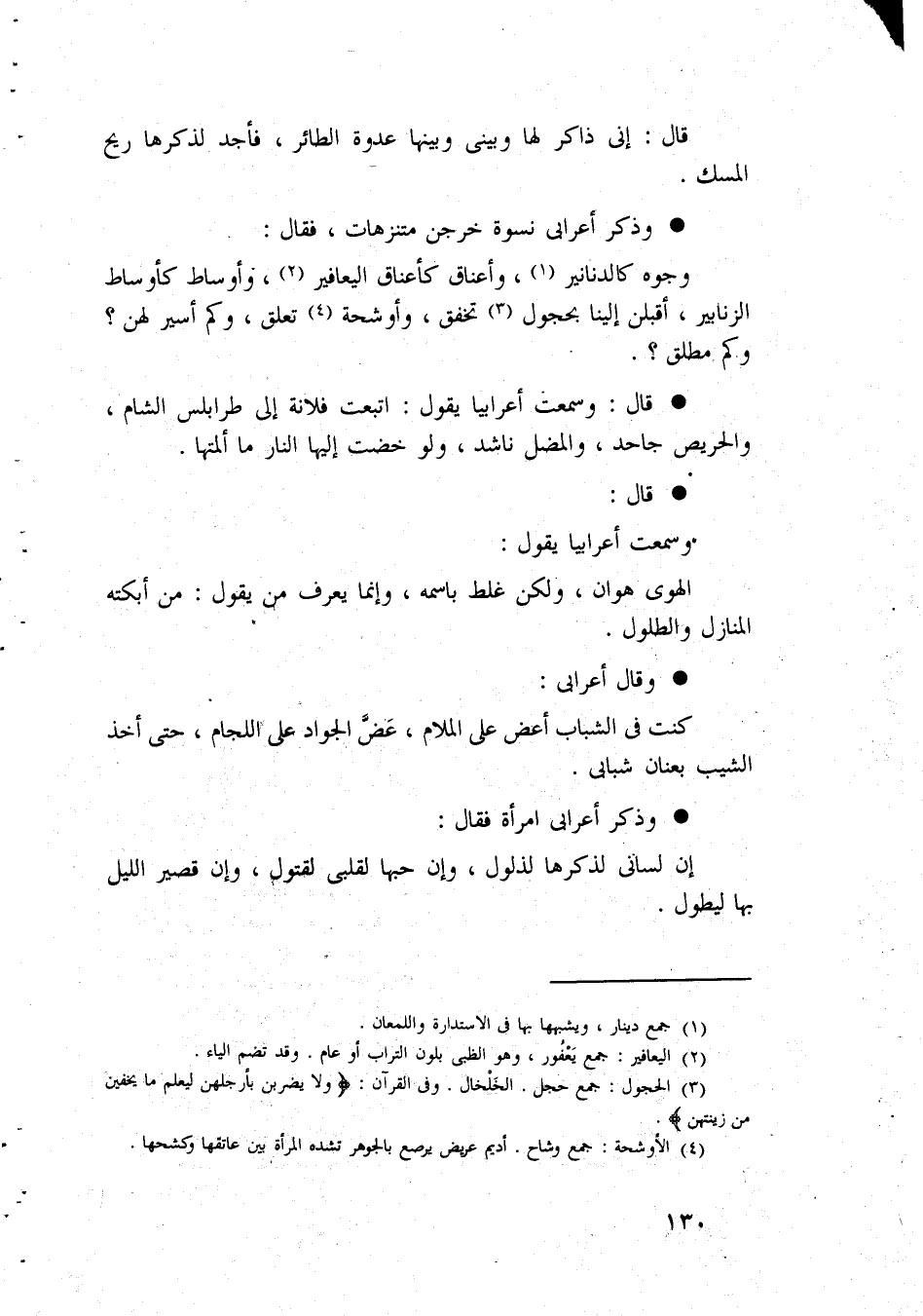 قَالَ إِنِّي لَهَا وبينى وَبَينهَا عدوة الطَّائِر فأجد لذكرها ريح الْمسك وَذكر أَعْرَابِي نسْوَة خرجن متنزهات فَقَالَ وُجُوه كالدنانير وأعناق كأعناق اليعافير وأوساط كأوساط الزنابير أقبلن إِلَيْنَا بحجول تخفق وأوشحة تعلق وَكم أَسِير لَهُنَّ وَكم مُطلق قَالَ وَسمعت أَعْرَابِيًا يَقُول اتبعت فُلَانَة إِلَى طرابلس الشَّام والحريص جَاحد والمضل نَاشد وَلَو خضت إِلَيْهَا النَّار مَا ألمتها قَالَ وَسمعت أَعْرَابِيًا يَقُول الْهوى هوان وَلَكِن غلظ باسمه وَإِنَّمَا يعرف من يَقُول من أبكته الْمنَازل والطلول وَقَالَ أعرابى كنت فى الشَّبَاب أعض على الملام عض الْجواد على اللجام حَتَّى أَخذ الشيب بعنان شبابى وَذكر أَعْرَابِي امْرَأَة فَقَالَ إِن لسانى لذكرها لذلول وَإِن حبها لقلبى لقتول وَإِن قصير اللَّيْل بهَا ليطول
