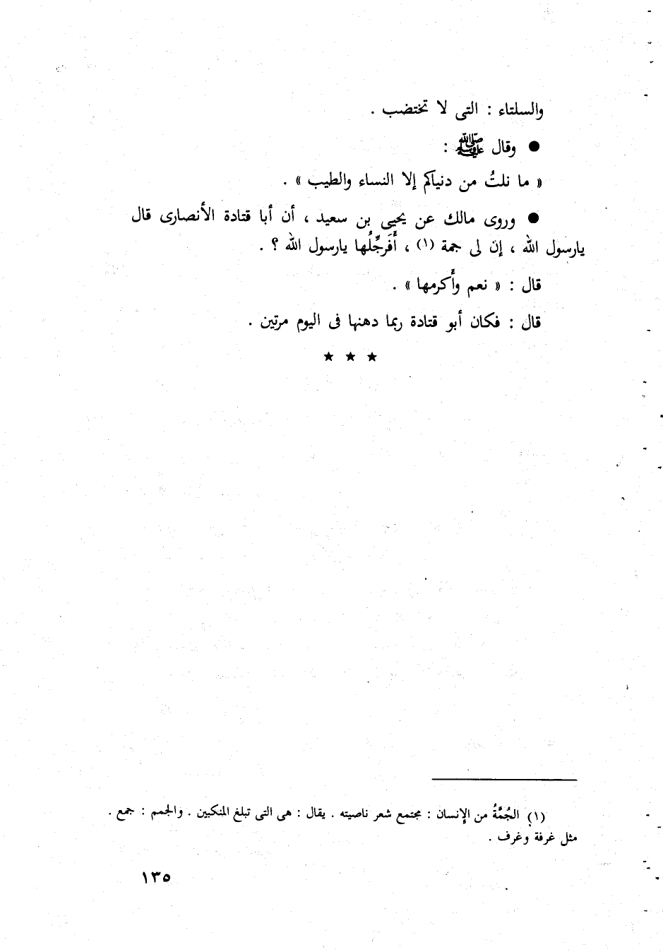 والسلتاء الَّتِى لَا تختضب وَقَالَ مَا نلْت من دنياكم إِلَّا النِّسَاء وَالطّيب وروى مَالك عَن يحيى بن سعيد أَن أَبَا قَتَادَة الأنصارى قَالَ يَا رَسُول الله إِن لى جمة أفرجلها يَا رَسُول الله قَالَ نعم وَأَكْرمهَا قَالَ فَكَانَ أَبُو قَتَادَة رُبمَا دهنها فى الْيَوْم مرَّتَيْنِ