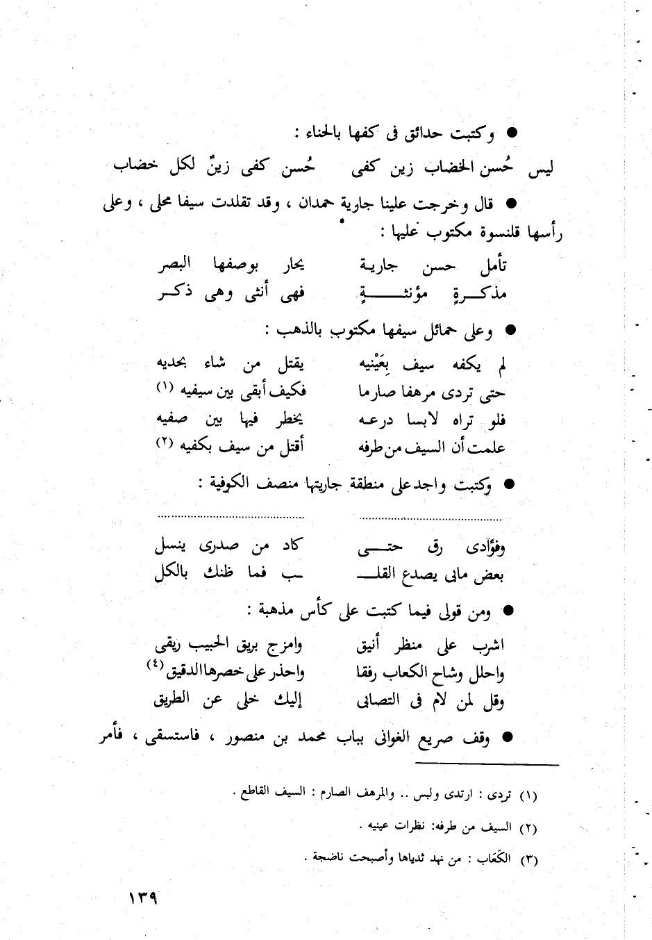 وكتبت حدائق فى كفها بِالْحِنَّاءِ لَيْسَ حسن الخضاب زين كفى حسن كفى زين لكل خضاب وَقَالَ وَخرجت علينا جَارِيَة حمدَان وَقد تقلدت سَيْفا محلى وعَلى رَأسهَا قلنوسة مَكْتُوب عَلَيْهَا تَأمل حسن جَارِيَة يحار بوصفها الْبَصَر مَذْكُورَة مُؤَنّثَة فهى أُنْثَى وهى ذكر وعَلى حمائل سيفها مَكْتُوب بِالذَّهَب لم يكفه سيف بِعَيْنيهِ يقتل من شَاءَ بحديه حَتَّى تردى مرهفا صَارِمًا فَكيف أبقى بَين سيفيه فَلَو ترَاهُ لابسا درعه يخْطر فِيهَا بَين صَفيه علمت أَن السَّيْف من طرفه أقتل من سيف بكفيه وكتبت وَاجِد على منْطقَة جاريتها منصف الكوفية وفؤادى رق حَتَّى كَاد من صدرى ينسل بعض مَا بى يصدع القل ب فَمَا ظَنك بِالْكُلِّ وَمن قولى فِيمَا كتبت على كأس مذهبَة اشرب على منظر أنيق وامزج بريق الحبيب ريقى واحلل وشاح الكعاب رفقا وَاحْذَرْ على خصرها الدَّقِيق وَقل لمن لَام فى التصابى إِلَيْك خلى عَن الطَّرِيق وقف صريع الغوانى بِبَاب مُحَمَّد بن مَنْصُور فَاسْتَسْقَى فَأمر