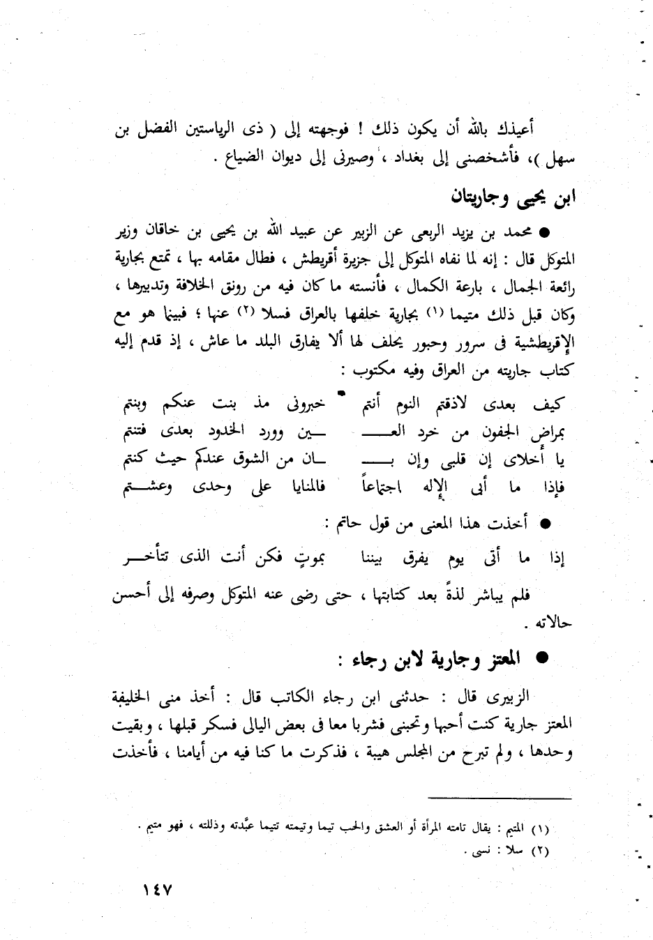 أُعِيذك بِاللَّه أَن يكون ذَلِك فوجهته إِلَى ذى الرياستين الْفضل بن سهل فأشخصنى إِلَى بَغْدَاد وصيرنى إِلَى ديوَان الضّيَاع ابْن يحيى وجاريتين مُحَمَّد بن يزِيد الربعى عَن الزبير عَن عبيد الله بن يحيى بن خاقَان وَزِير المتَوَكل قَالَ إِنَّه لما نَفَاهُ المتَوَكل إِلَى جَزِيرَة أقريطش فطال مقَامه بهَا تمتّع بِجَارِيَة رائعة الْجمال بارعة الْكَمَال فانسته مَا كَانَ فِيهِ من رونق الْخلَافَة وتدبيرها وَكَانَ قبل ذَلِك متيما بِجَارِيَة خلفهَا بالعراق فسلا عَنْهَا فَبَيْنَمَا هُوَ مَعَ الإقريطشية فى سرُور وحبور يحلف لَهَا أَلا يُفَارق الْبَلَد مَا عَاشَ إِذْ قدم إِلَيْهِ كتاب جَارِيَته من الْعرَاق وَفِيه مَكْتُوب كَيفَ بعدى لَا ذقتم النّوم أَنْتُم خبروني مذ بنت عَنْكُم وبنتم بمراض الجفون من خرد الْعين وَورد الخدود بعدى فتنتم يَا أخلاى إِن قلبى وَإِن ان من الشوق عنْدكُمْ حَيْثُ كُنْتُم فَإِذا مَا أَبى الْإِلَه اجتماعا فالمنايا على وحدى وعشتم أخذت هَذَا الْمَعْنى من قَول حَاتِم إِذا مَا أَتَى يَوْم يفرق بَيْننَا بِمَوْت فَكُن أَنْت الذى تتأخر فَلم يُبَاشر لَذَّة بعد كتَابَتهَا حَتَّى رضى عَنهُ المتَوَكل وَصَرفه إِلَى أحسن حالاته المعتز وَجَارِيَة لِابْنِ رَجَاء الزبيرِي قَالَ حَدَّثَنى ابْن رَجَاء الْكَاتِب قَالَ أَخذ منى الْخَلِيفَة المعتز جَارِيَة كنت أحبها وتحبنى فشربا مَعًا فى بعض اليالى فَسَكِرَ قبلهَا وَبقيت وَحدهَا وَلم تَبْرَح من الْمجْلس هَيْبَة فَذكرت مَا كُنَّا فِيهِ من أيامنا فَأخذت