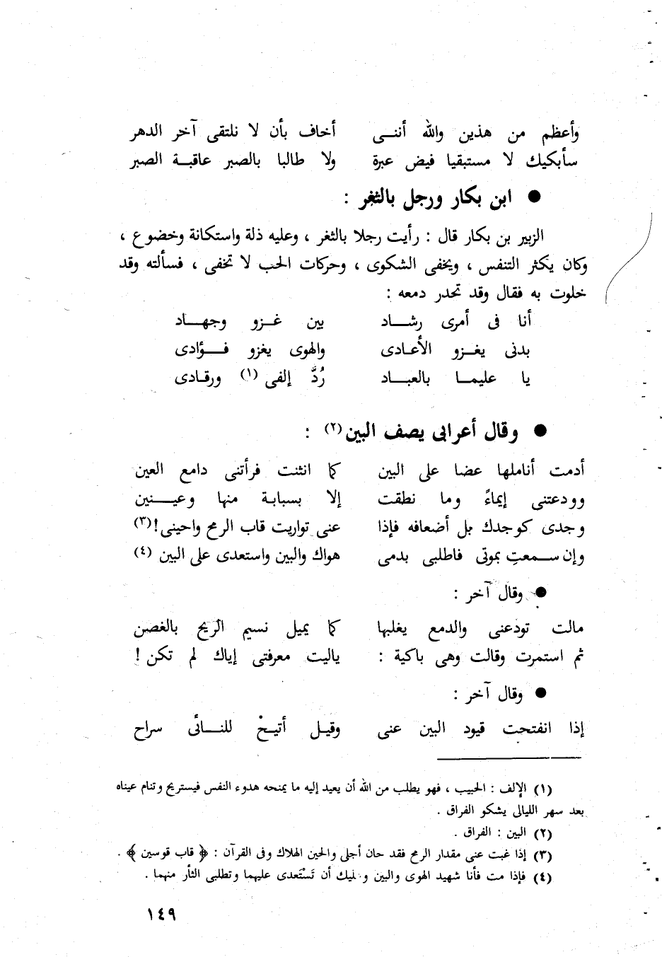 وَأعظم من هذَيْن وَالله اننى أَخَاف بِأَن لَا نلتقى آخر الدَّهْر سأبكيك لَا مستبقيا فيض عِبْرَة وَلَا طَالبا بِالصبرِ عَاقِبَة الصَّبْر ابْن بكار وَرجل بالثغر الزبير بن بكار قَالَ رَأَيْت رجلا بالثغر وَعَلِيهِ ذلة واستكانة وخضوع وَكَانَ يكثر التنفس وَيخْفى الشكوى وحركات الْحبّ لَا تخفى فَسَأَلته وَقد خلوت بِهِ فَقَالَ وَقد تحدر دمعه أَنا فى أمرى رشاد بَين غَزْو وَجِهَاد بدنى يَغْزُو الأعادى والهوى يَغْزُو فؤادى يَا عليما بالعباد رد إلفى ورقادى وَقَالَ أعرابى يصف الْبَين أدمت أناملها عضا على الْبَين كَمَا انْثَنَتْ فرأتنى دامع الْعين وودعتنى إِيمَاء وَمَا نطقت إِلَّا بسبابة مِنْهَا وعينين وجدى كوجدك بل أضعافه فَإِذا عَنى تواريت قاب الرمْح واحينى وَإِن سَمِعت بموتى فاطلبى بدمى هَوَاك والبين واستعدى على الْبَين وَقَالَ آخر مَالَتْ تودعنى والدمع يغلبها كَمَا يمِيل نسيم الرّيح بالغصن ثمَّ استمرت وَقلت هوى باكية يَا لَيْت معرفتى إياك لم تكن وَقَالَ آخر إِذا انفتحت قيود الْبَين عَنى وَقيل أتيح للنائى سراح