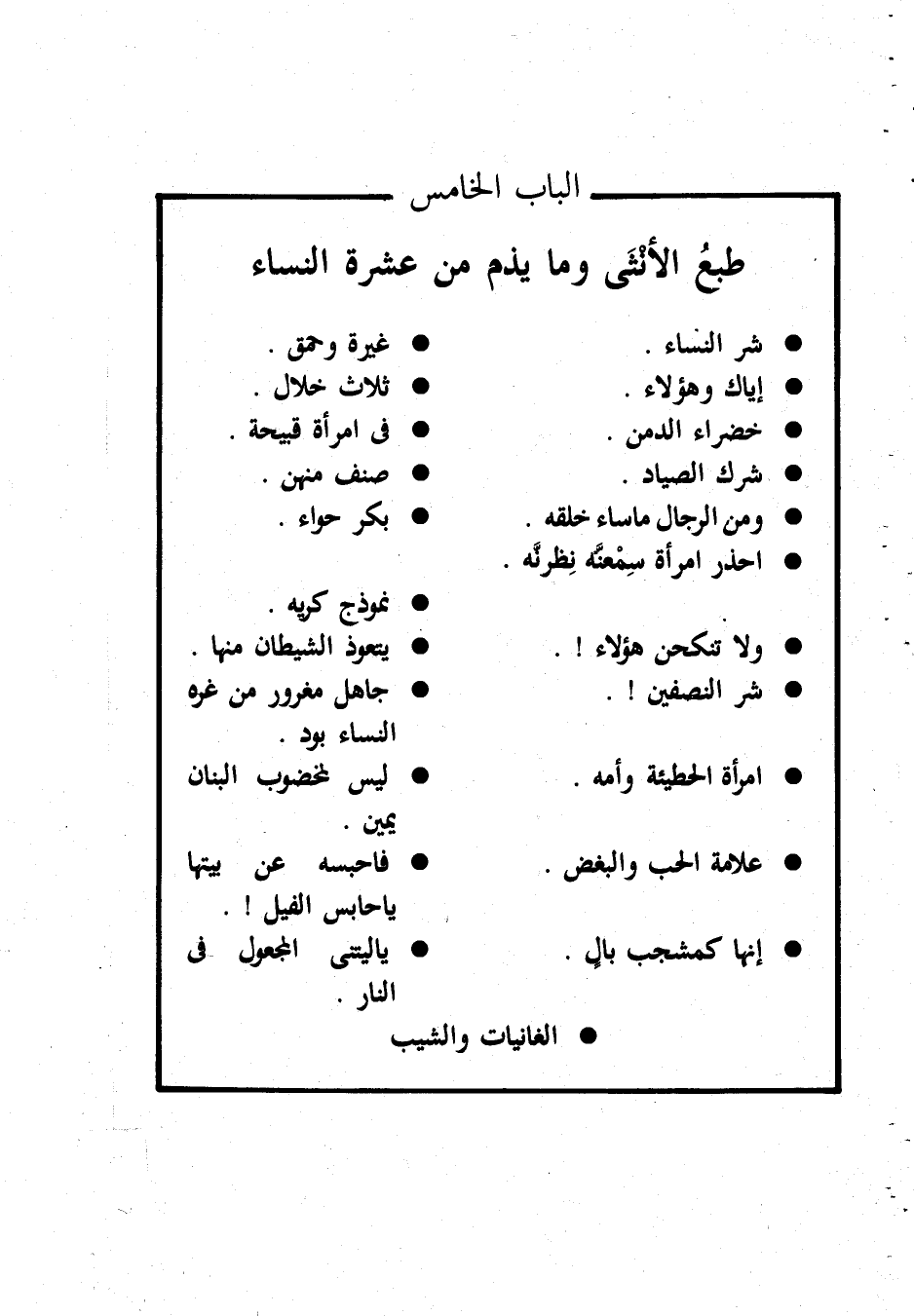 الْبَاب الْخَامِس طبع الْأُنْثَى وَمَا يذم من عشرَة النِّسَاء شَرّ النِّسَاء إياك وَهَؤُلَاء خضراء الدمن شرك الصياد وَمن الرِّجَال مَا سَاءَ خلقه احذر امْرَأَة سمعنه نظرنه وَلَا تنكحن هَؤُلَاءِ شَرّ النصفين امْرَأَة الحطيئة وَأمه عَلامَة الْحبّ البغض إِنَّهَا كمشجب بَال غيرَة وحمق ثلال خلال فى امْرَأَة قبيحة صنف مِنْهُنَّ بكر حَوَّاء نموذج كريه يتَعَوَّذ الشَّيْطَان مِنْهَا جَاهِل مغرور من غره النِّسَاء بود لَيْسَ لمخضوب البنان يَمِين فاحبسه عَن بَيتهَا يَا حَابِس الْفِيل يَا ليتنى المجعول فى النَّار الغانيات والشيب